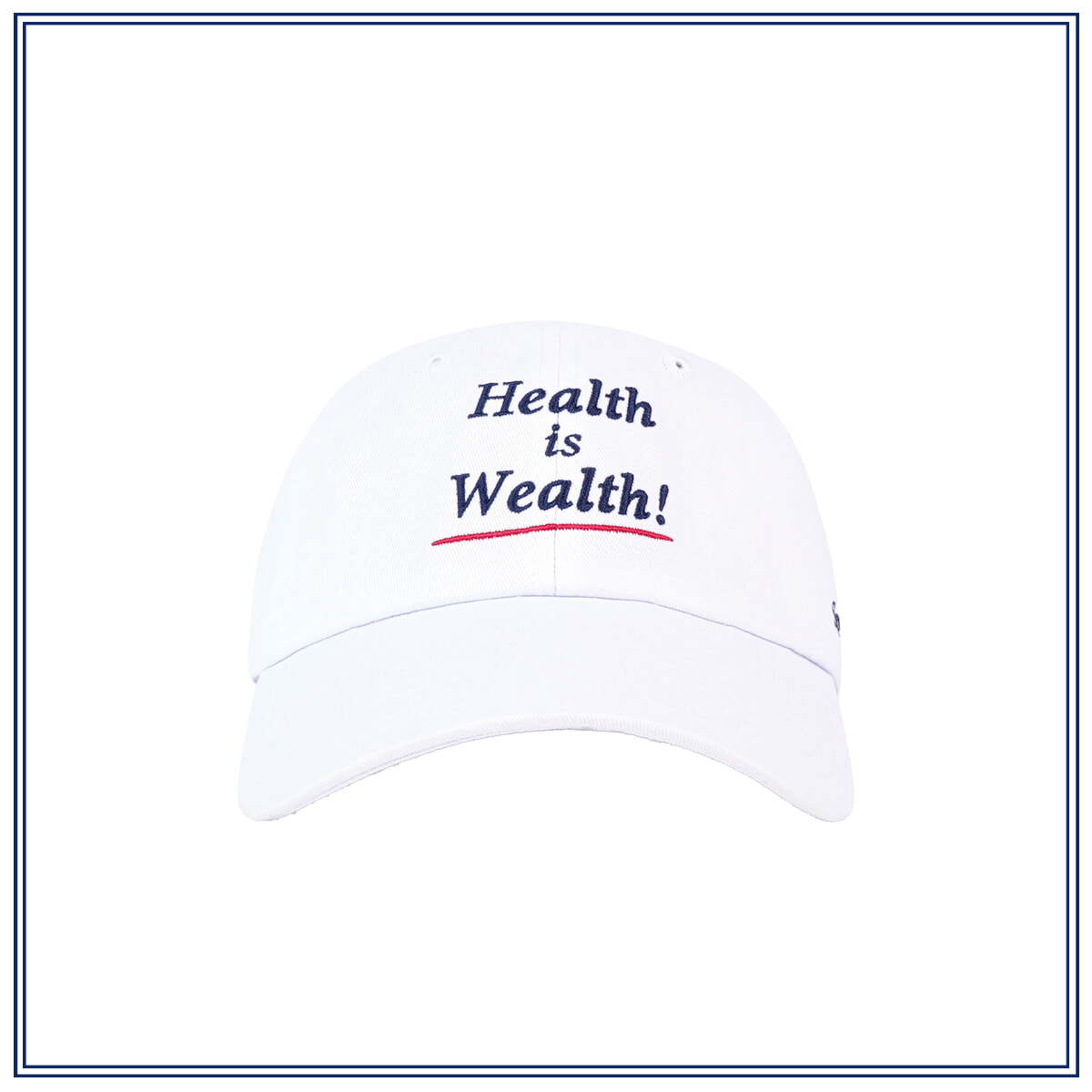 ブランドのキーとなる「HEALTH IS WEALTH !(=健康が富)」をフロントに刺繍したロゴキャップが、エレガンス漂う大人のスポーティルックに仕上げる。不定期に刊行される同名雑誌のアパレルラインらしい、ミニマルかつクリーンな印象。