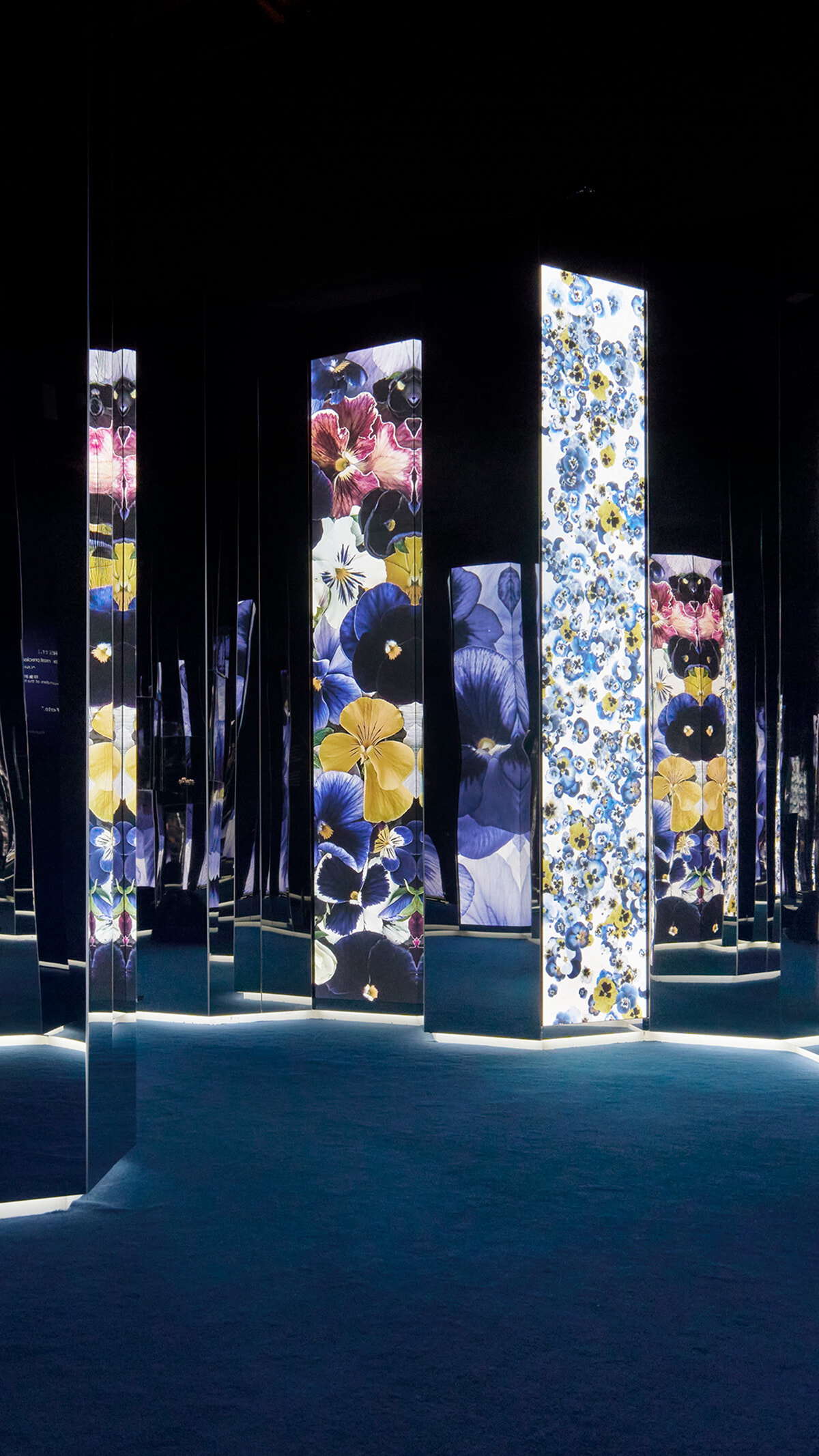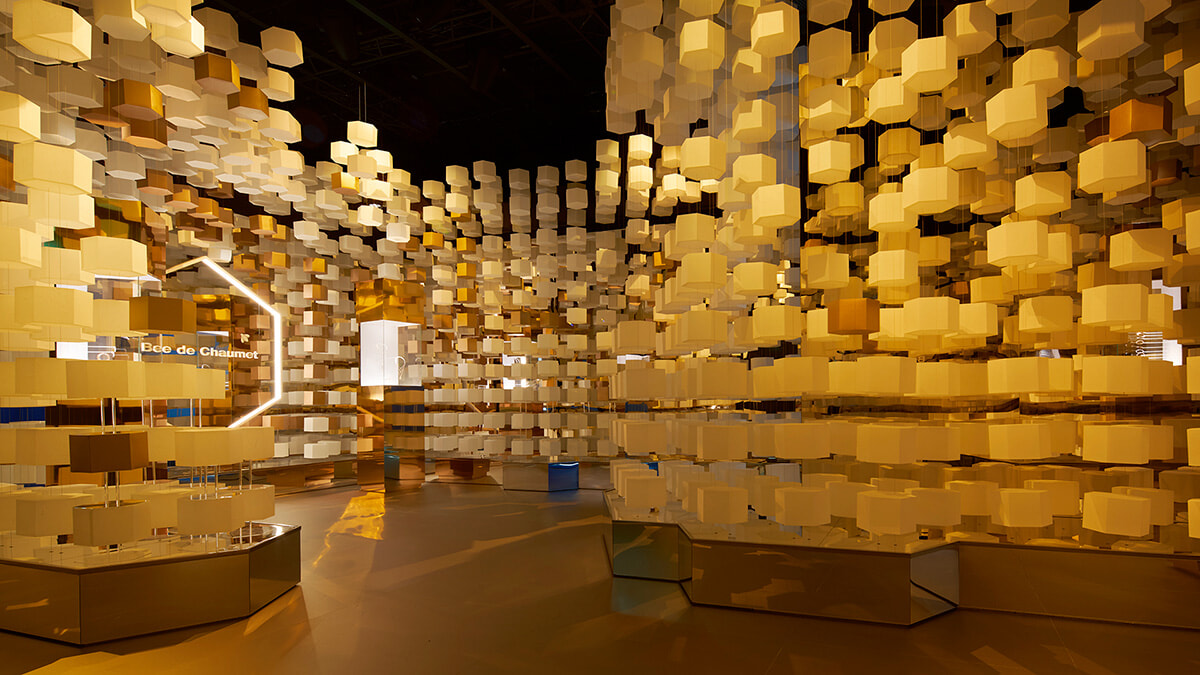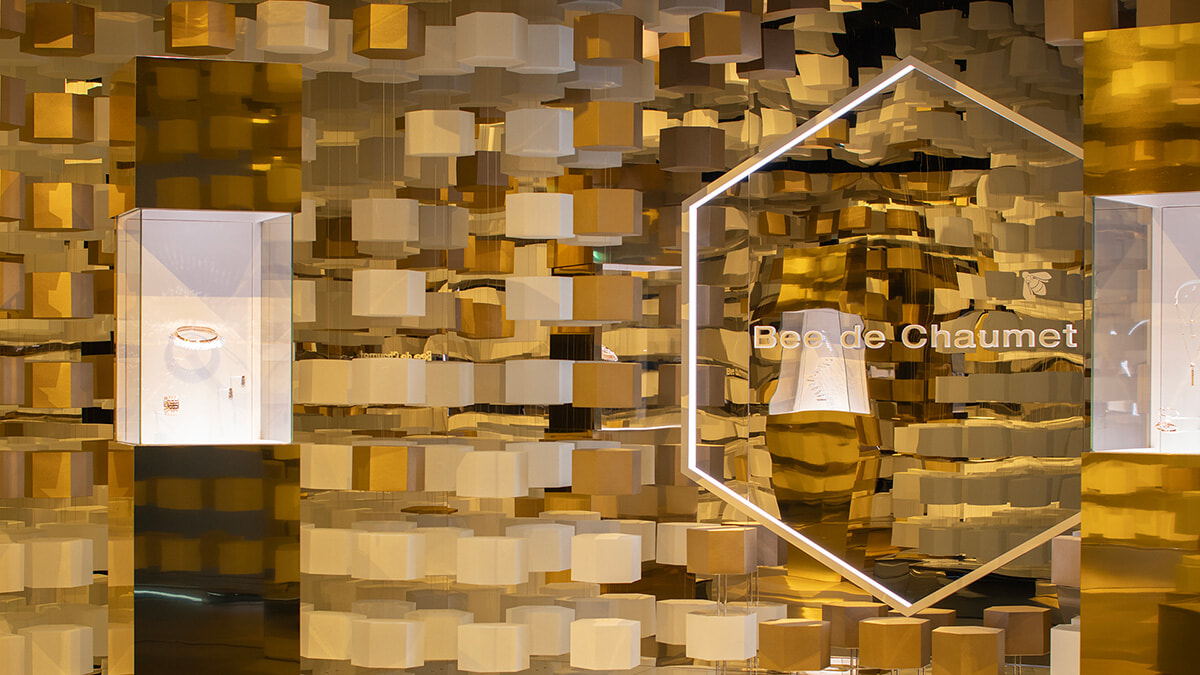 日本の伝統と職人技に敬意を込め、和紙で精巧につくられたハニカムモチーフが無限に連なり光を浴びる、荘厳な空間。「ビー ドゥ ショーメ」コレクションの作品も展示されている。
