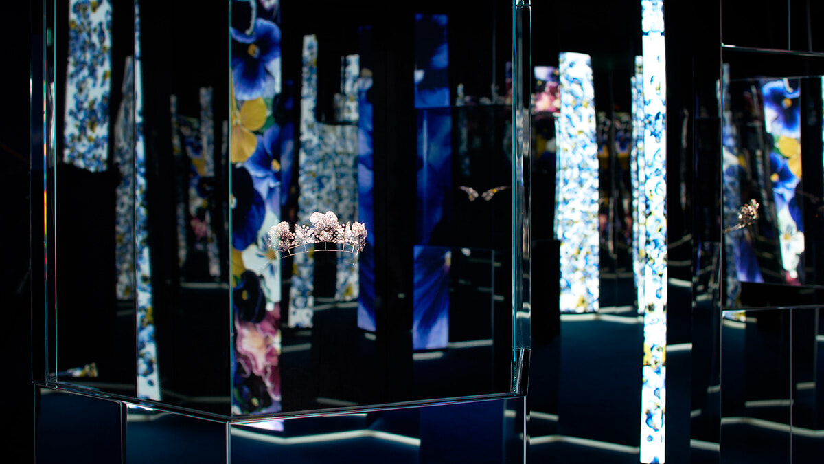 メゾンのDNAである自然とジュエリーのつながりを体感できる会場デザイン。
