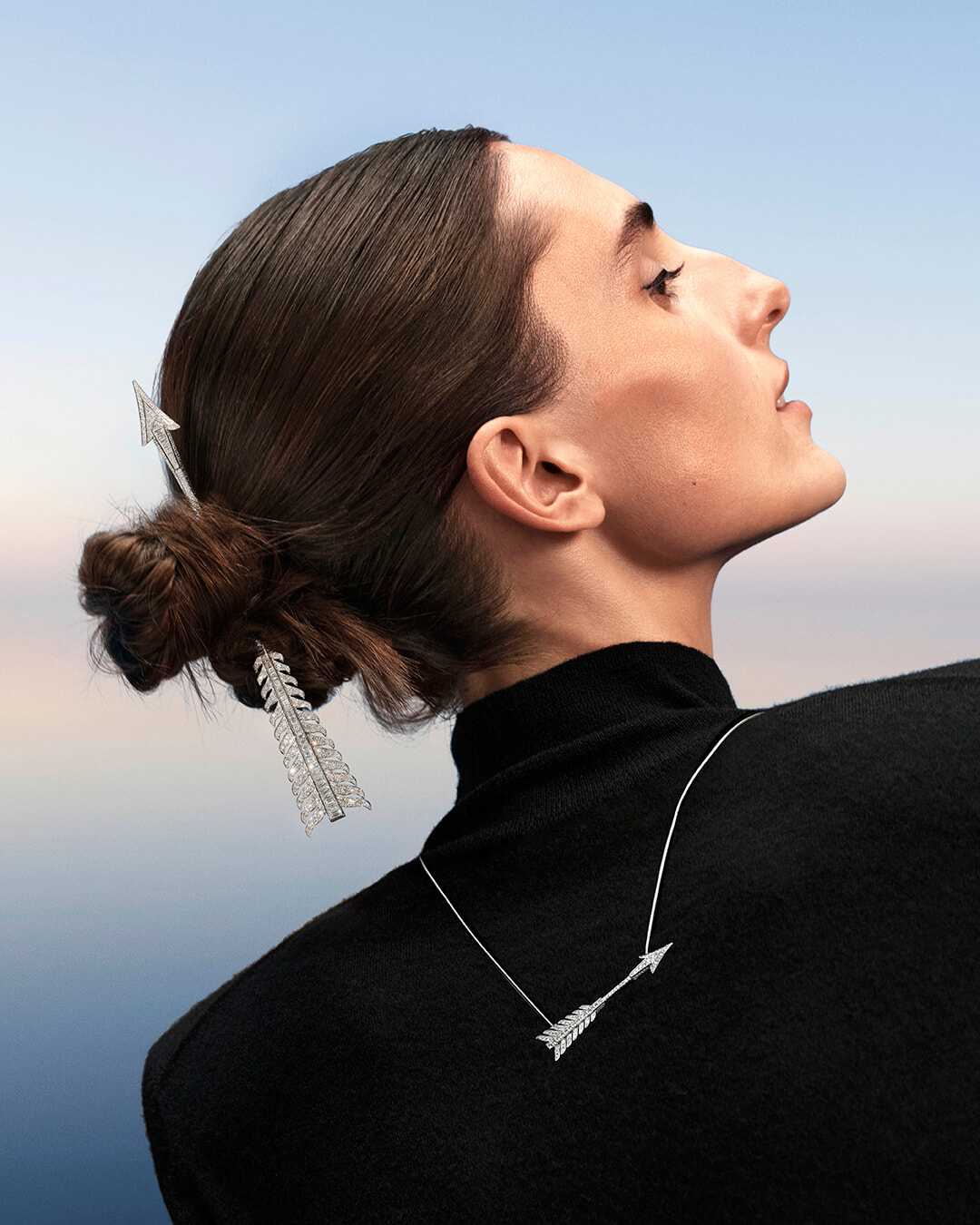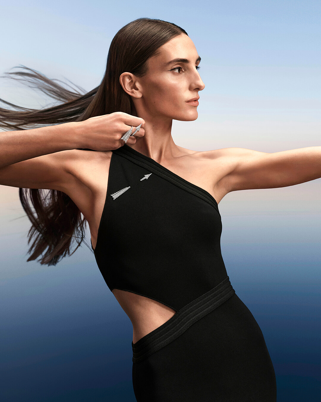 そしてこの度、矢というモチーフに内在する力強さと繊細さの絶妙なバランス、それが織りなす緊張感に魅了されたクリエイティブディレクターのクレール・ショワンヌにより、ジェンダーレスな8点のモノクロームのジュエリーが誕生。これらはすべてホワイトゴールドとダイヤモンドで作られ、ダイヤモンドの輝きが力強さと繊細さを表現する。また、矢の「目標を貫く」という性質を表現し、直線と曲線が入り交じるデザインがモダンな魅力にあふれている。