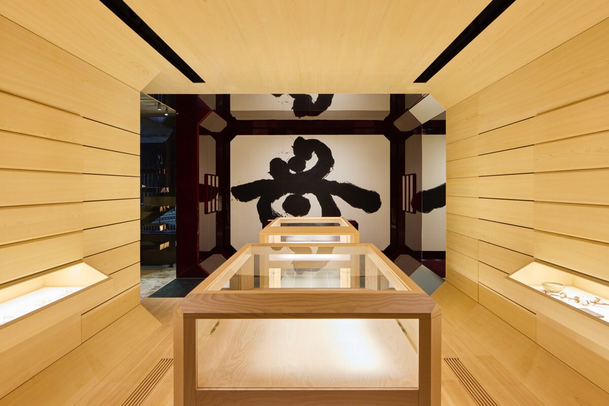 神聖な素材である檜で仕上げられた床と壁に囲まれた空間の奥の書は、宮古島出身の書家・新城大地郎によるもの。彼の祖父は高名な禅僧であり民俗学者の岡本恵昭。それを受け継ぎ、禅や沖縄の精神性を背景にしたその書は、伝統的な書を現代的に再解釈した作品となっている。「母」の一字に込めた想いについて新城は、最近父親となった自身の経験とあわせて「JMMの哲学と思想から生まれたアイデアから、職人一人ひとりの手仕事によって誕生するJMMの作品は、唯一無二の命が誕生する奇跡と同様、美しいものがこの世に放たれた証だと思います。それらを育む母体は創造性と愛を持った無限のエネルギーです。我が子が誕生する以前、大きなお腹に耳を当てた時に私に跳ね返してきた子どもの鼓動を忘れません。そんな鼓動がまるで聞こえてくるような、生命力を感じるような作品『母船』を目指しました」と述べる。