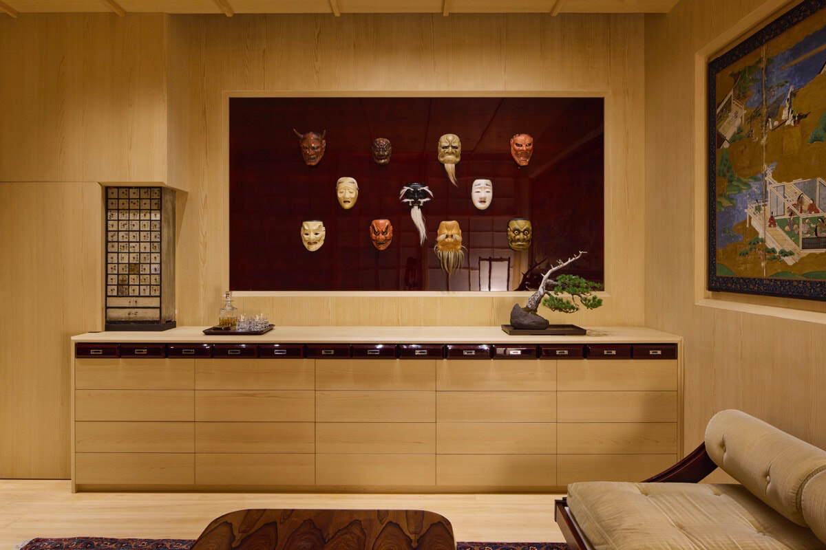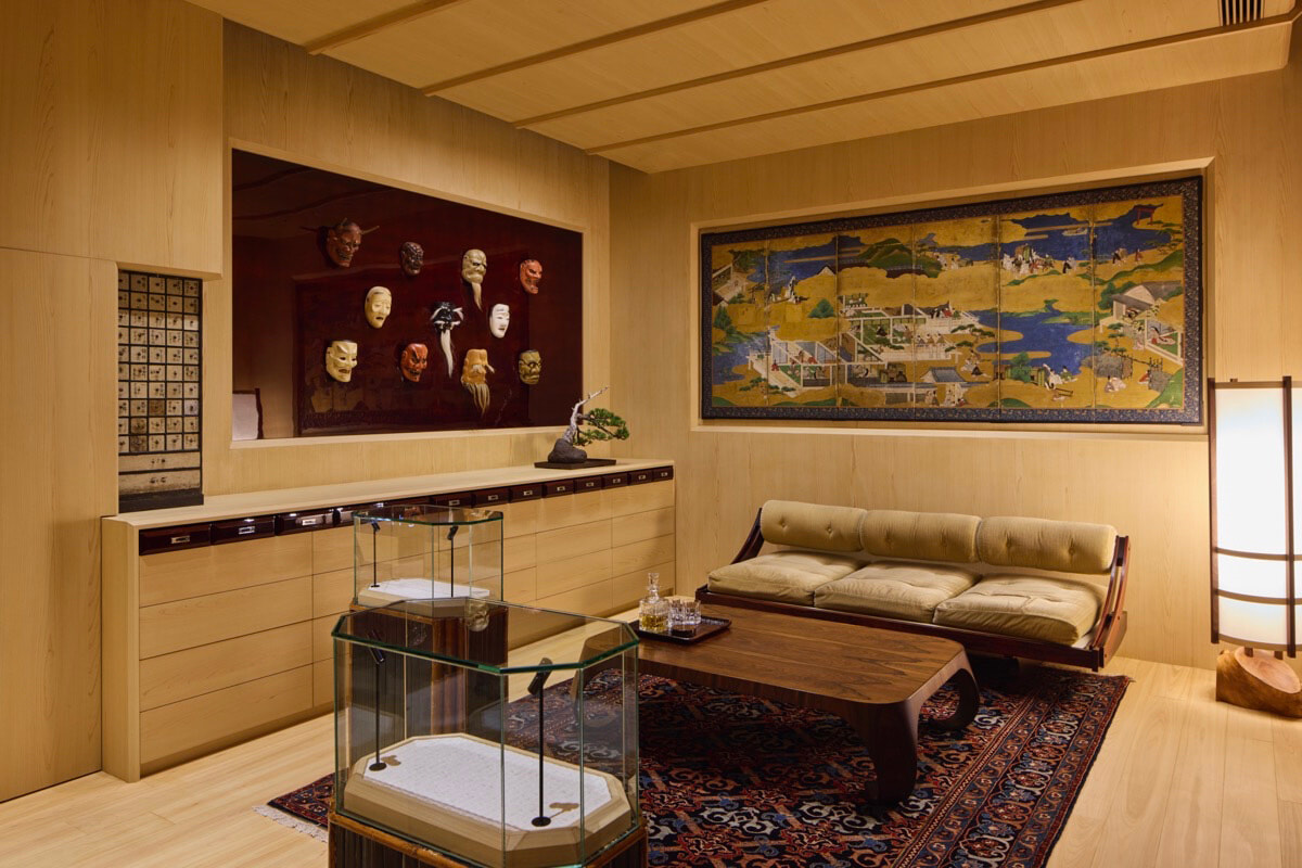 空間全体は、まるでプライベートレジデンスのような親密さを醸し出し、アメリカ西部、フランス帝政期、日本の歴史からのインスピレーションが絶妙に融合。希少な骨董品や芸術品、瞑想石などの博物館級の品々が展示され、それらはナバホ族のラグ、ヴィンテージのイタリア製チェア、17世紀ヨーロッパの光学機器の壁と巧みに対比されている。