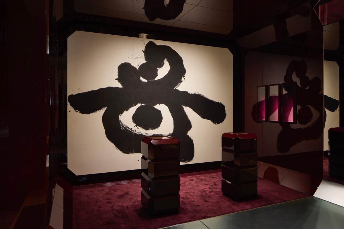 JMMのこだわりの製品の数々はもちろん、創設者ジェローム・ジャック・マリー・マージュとSIMPLICITY主宰の緒方慎一郎のコラボレーションによる空間も必見。エントランス奥には、書家・新城大地郎による「母」の書が飾られている。