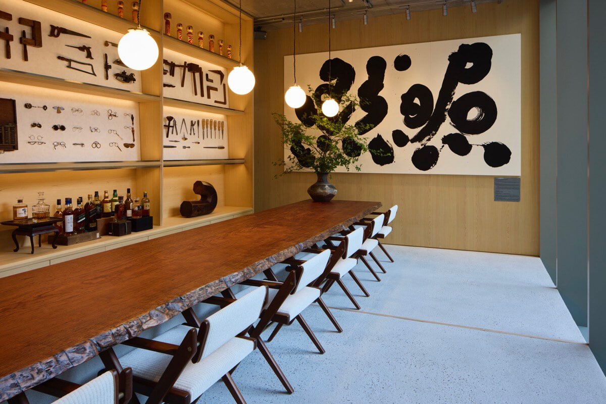 船のエンジンルームに見立てた地下1階は、「JMMの心臓部」。「メガネをお客様一人一人のために仕上げていくアトリエをもち、一枚板のカウンターはお客さまが選んだメガネと静かにゆっくりと対話する場所となります。2階はキャプテンキャビンをイメージし、ジェローム氏の好奇心を詰め込みました。古い美術品、家具、書物、オブジェがジャック・マリー・マージュのデザインの種を感じさせてくれます」と緒方。2階はジュエリーおよびカスタム専用スペースも擁し、そこでは江戸後期の六曲屏風が設られたバーで、ゲストはウイスキーを片手にゆったりとくつろぐこともできる。一方地下1階ではシンプリシティ監修による和菓子とお茶でおもてなし。ここには新城のもうひとつの作品も展示され、時間と感性をめぐる旅にさらなる詩情を添える。