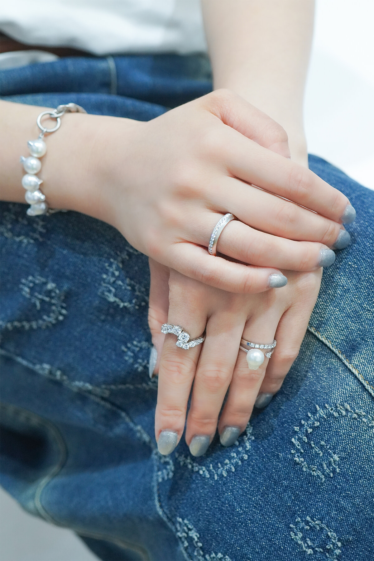 右手の Fluidity of Love Ring は大胆なダイヤモンド使いですが、グラデーションデザインのおかげでファッションに自然に馴染みます。