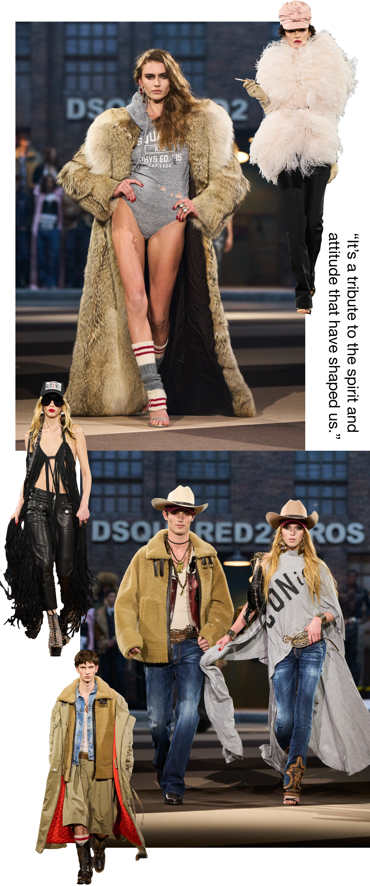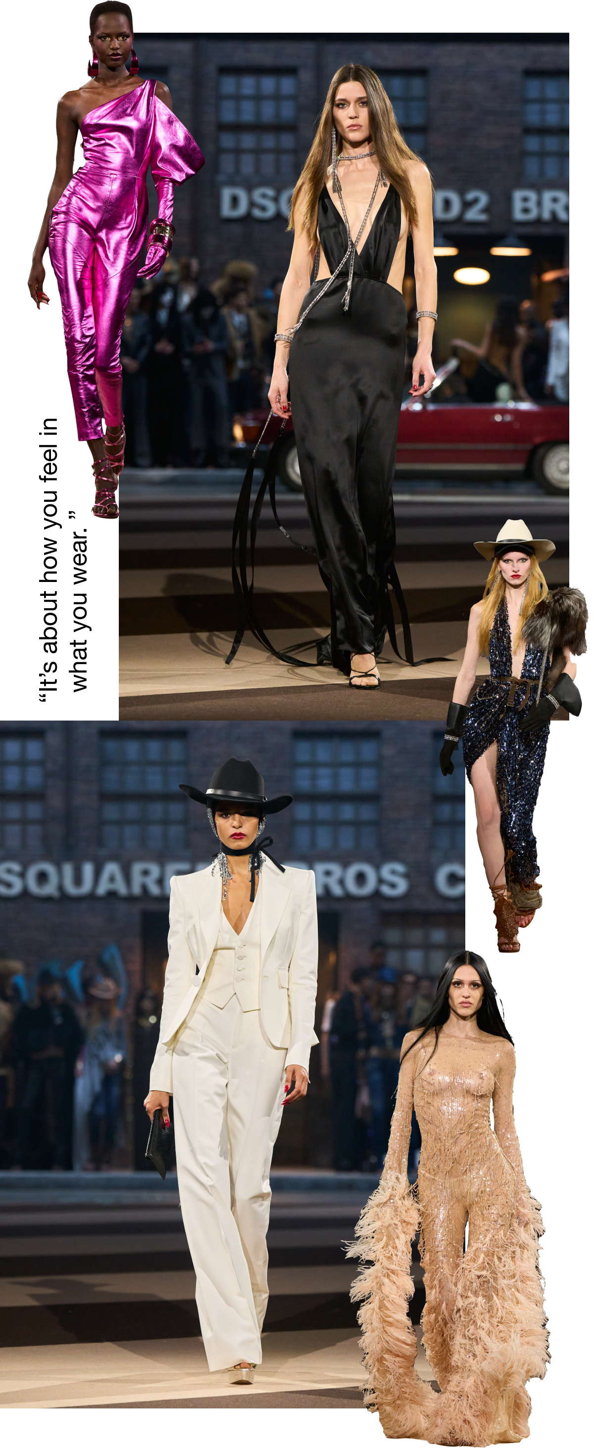 「今回のショーでは、ディースクエアードを定義するキャラクターやコードを称えることが大切でした。カウボーイはカナダのルーツを象徴し、たくましく少しワイルド。ディスコクイーンはグラマーで夜を照らす存在。グラムロッカーは反骨精神とアティテュードの表現です。観客がどう解釈するかを見るのも刺激的。私たちはアイデアから始め、それをコレクションで追求しますが、人々が何を見出すかも楽しみです。確かなのは、100%ディースクエアードらしい遊び心と、予想外の融合を愛しているということです」