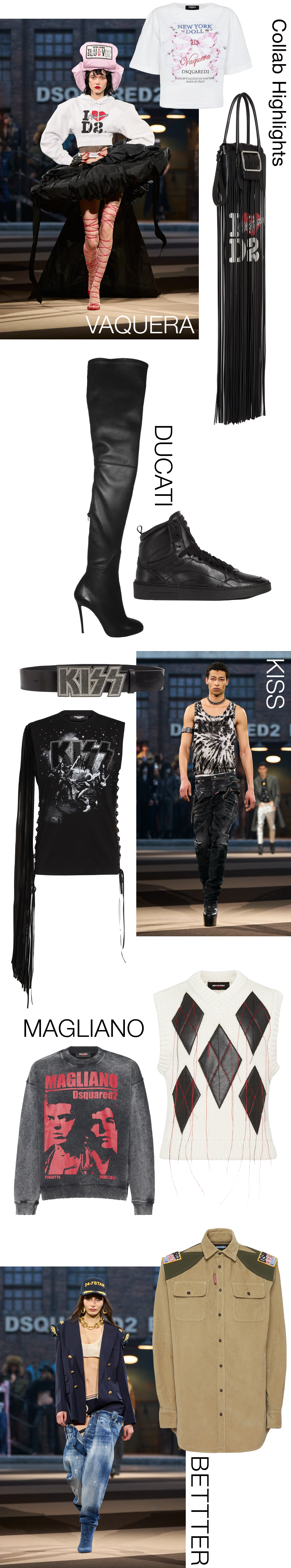 キッスの1975年の伝説的な「Alive!」ツアーのグッズにヒントを得た、ディースクエアードらしいひねりを加えたTシャツやスウェット、ドゥカティの新型「Xdiavel V4」の発売を記念して生まれたスニーカーやバッグなど。それぞれが独自のグルーヴを響かせ、自由と個性が交錯するセッションを生み出し、ブランドの世界観を力強く体現している。