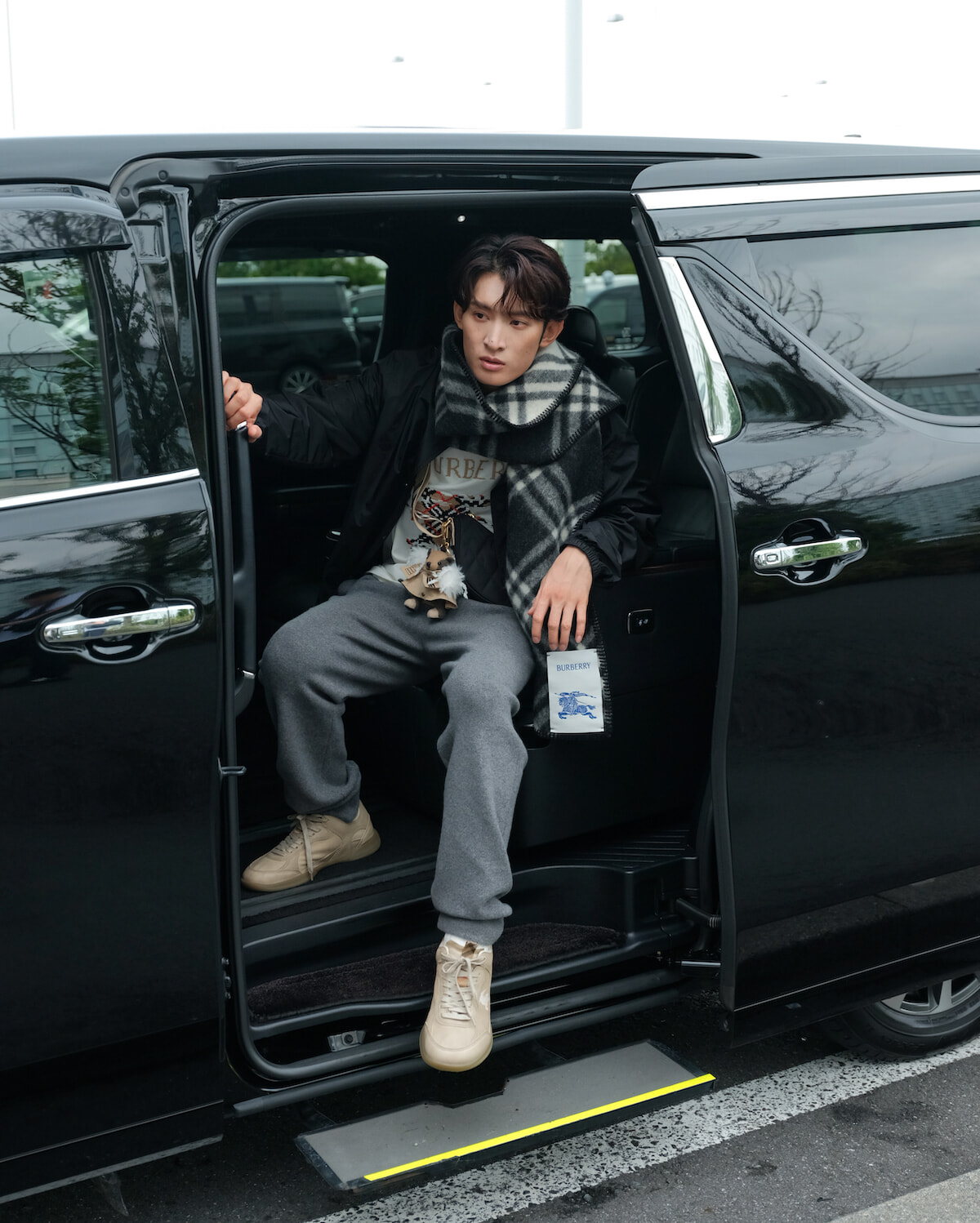 ロンドンで開催されるバーバリー 2026春夏コレクションへの出席のため、英国に出発する。バーバリーチェックのマフラーをシックに纏い、バッグにはメゾンのコードをあしらった愛らしいテディベアのチャームをプラスした空港ファッションも披露した。