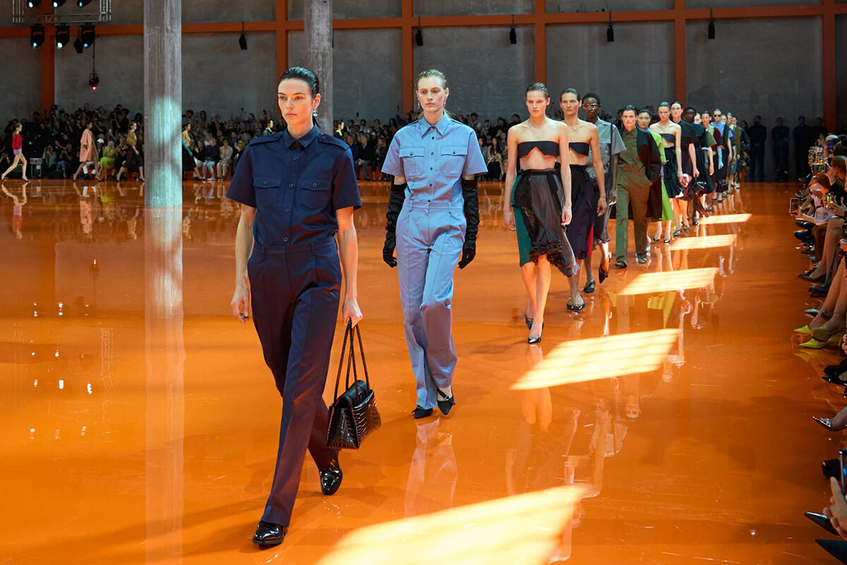 ファーストルックとクロージングルックには軍服を思わせるユニフォームが登場するも、それはイブニングドレスと同格であるとプラダは定義する。また、女性らしさの典型と言える、スカートは巨大なタンクトップのようだったり、オーバーサイズだったりと変形し、ブラジャーはかっちりとしたシェイプを伴わないデザインで表現されたりと、服の持つ根本的な性質を再考するように問いかけてくる。