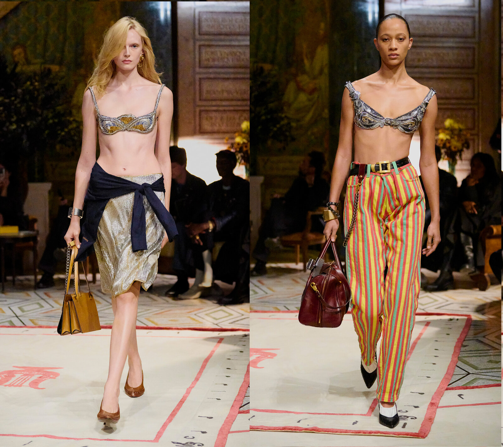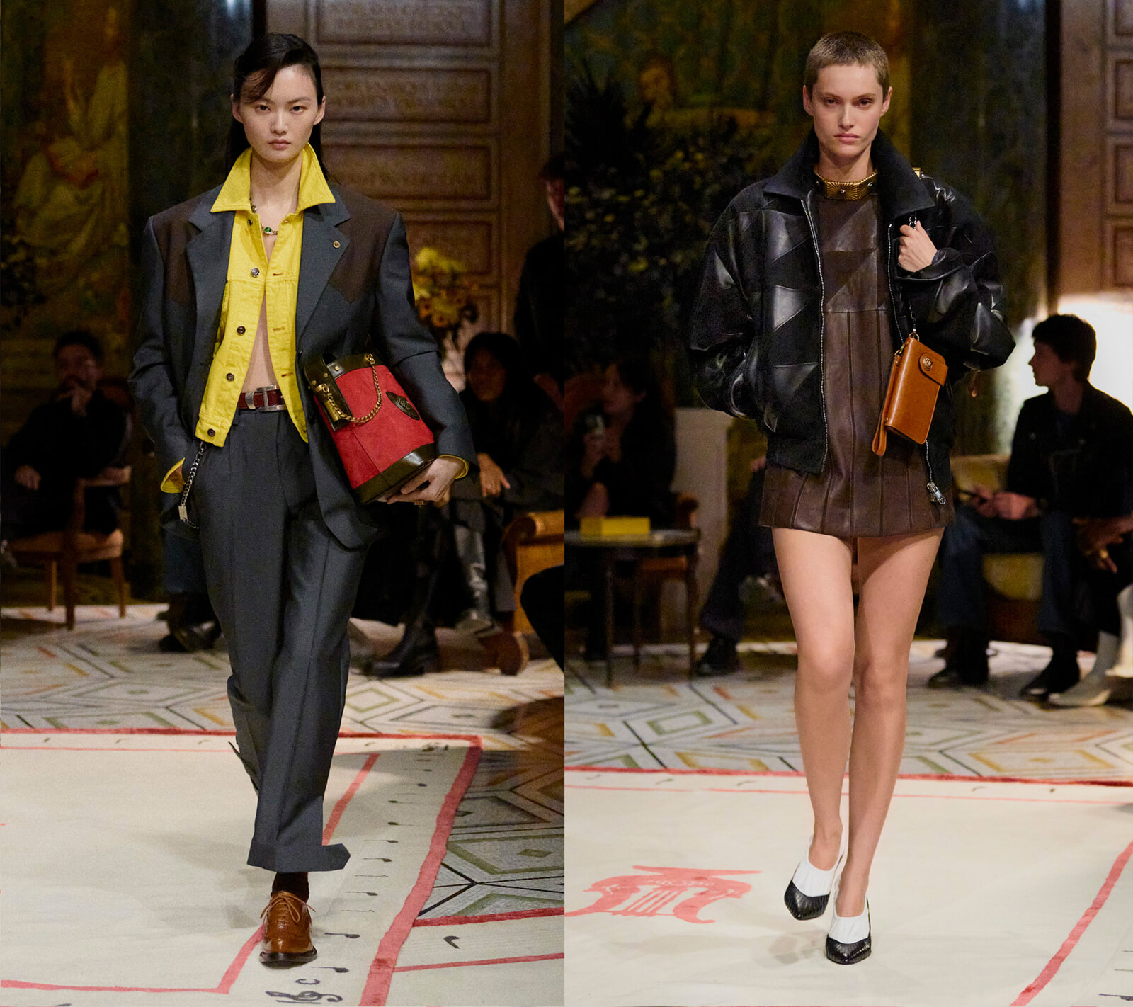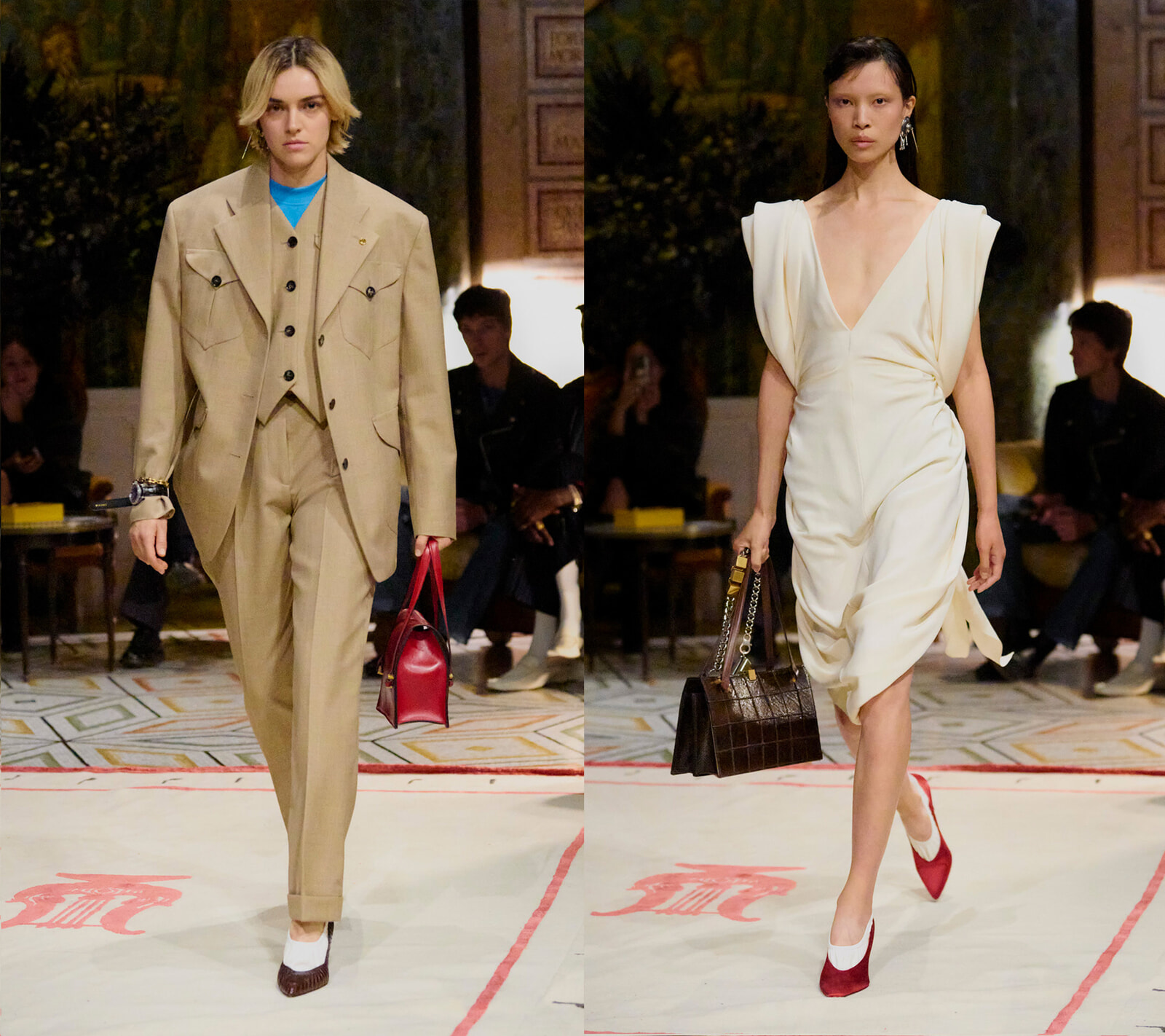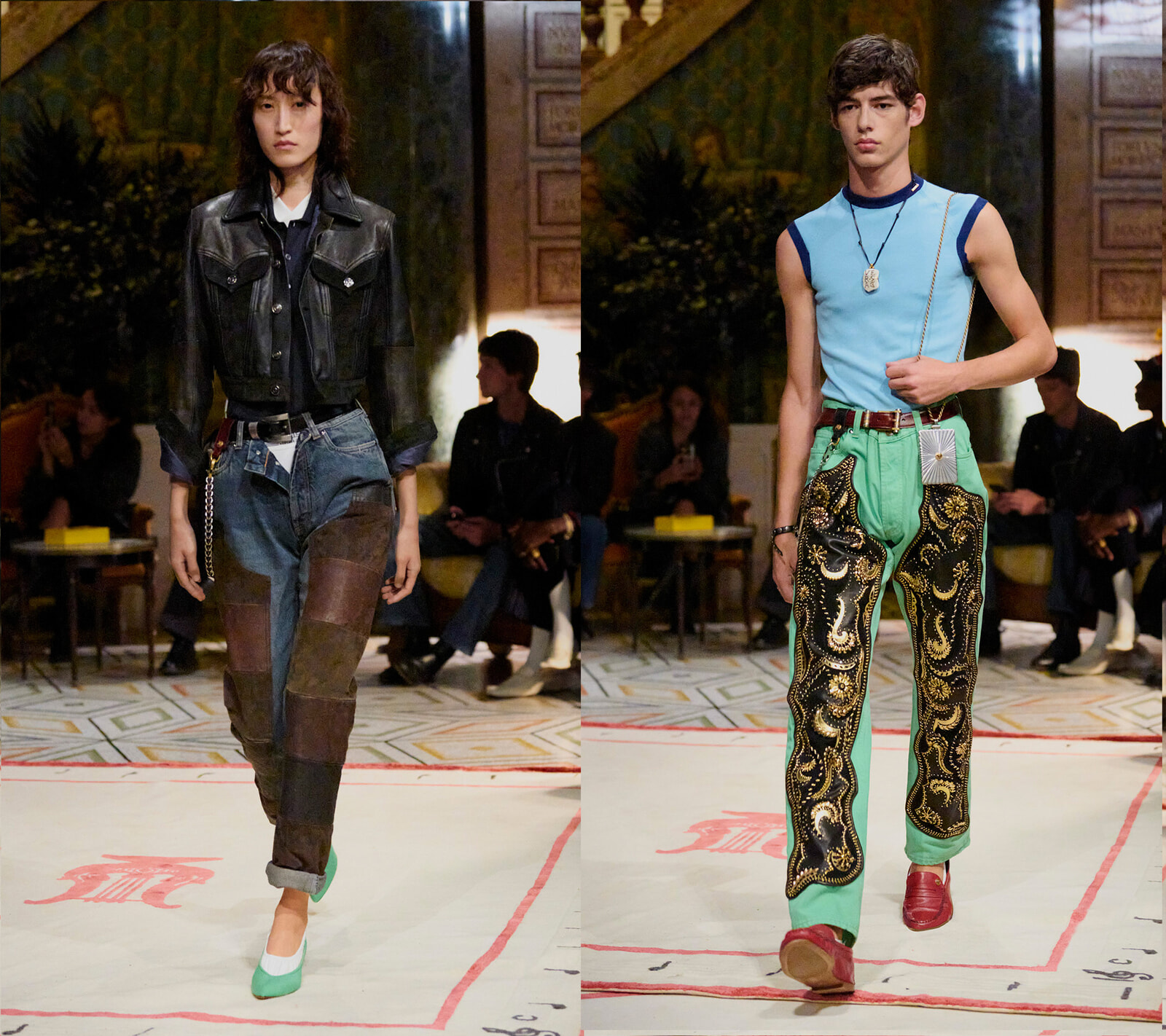 会場となったアンブロジアーナ美術館には、ヴェルサーチェがこれまで大切にしてきた神話や古代を基盤としたムードが広がり、その中にデニム、レザー、ジャケットにブルゾンといった新しくも現代的な要素を取り入れたルックが登場し、溶け合った。古代主義と現代のストリートの感覚が重なり、新しいイタリアンスタイルが誕生した瞬間だった。