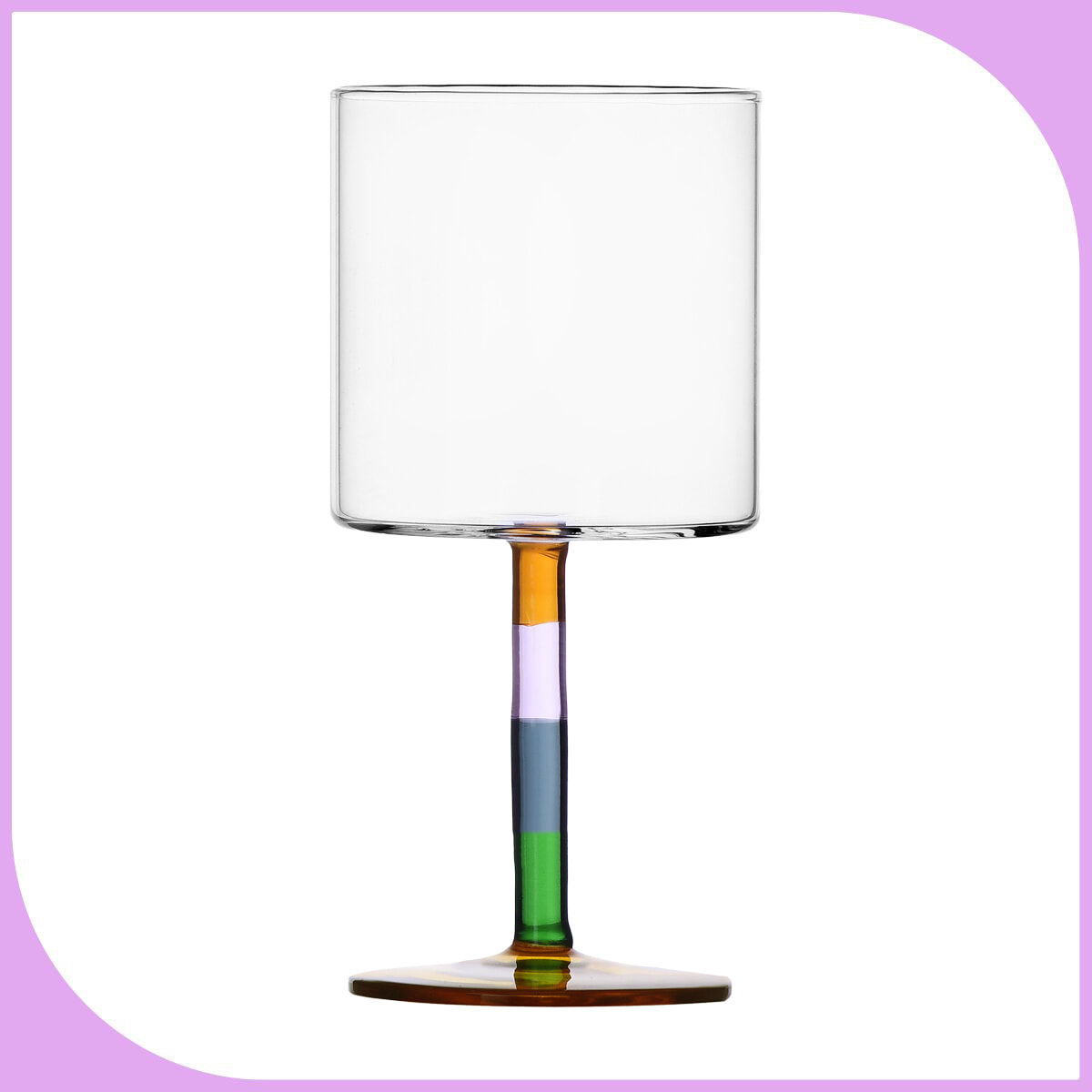 持ち手のカラーブロックが美しいワイングラス。円柱型のシンプルなフォルムは手入れも簡単で、特別な日だけでなく日常使いでもテーブルを格上げ。水を注ぐだけでも絵になるグラスが、食卓にさりげない華やぎを添えてくれる。