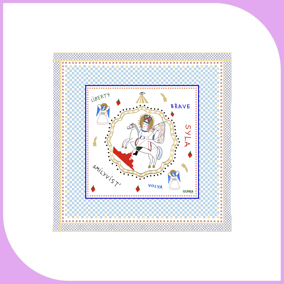 カルパティア地方に伝わるステンガラスにインスピレーションを受けた、周囲のモザイク柄が印象的。聖ジョージの像を中央に描いたポップなスカーフは、頭をすっぽりと覆うバブーシュカのように巻くのも◎。