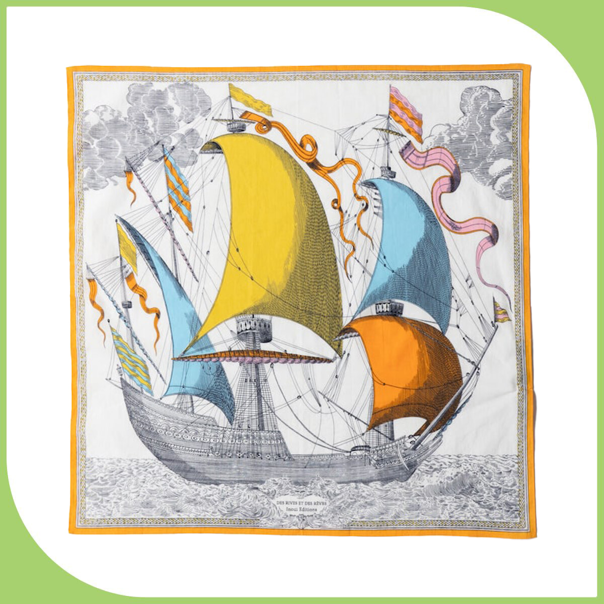 大海原を大きな帆を立て突き進む様子を描いたストーリーを感じる1枚。繊細なタッチと所々の明るいカラーとのバランスが絶妙なスカーフで、彩りのアクセントを加えて。