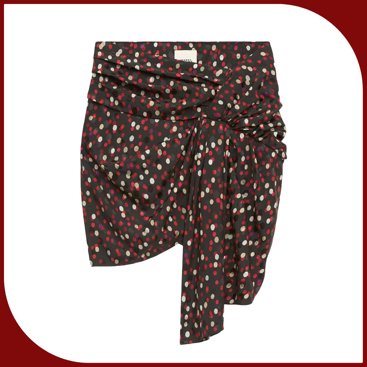 さらりと纏うだけで品の良さを醸し出す、サイドのドレープが印象的なミニスカート。可憐なポルカドットパターンがリズムを加え。1点投入でコーディネートをドラマティックに演出。