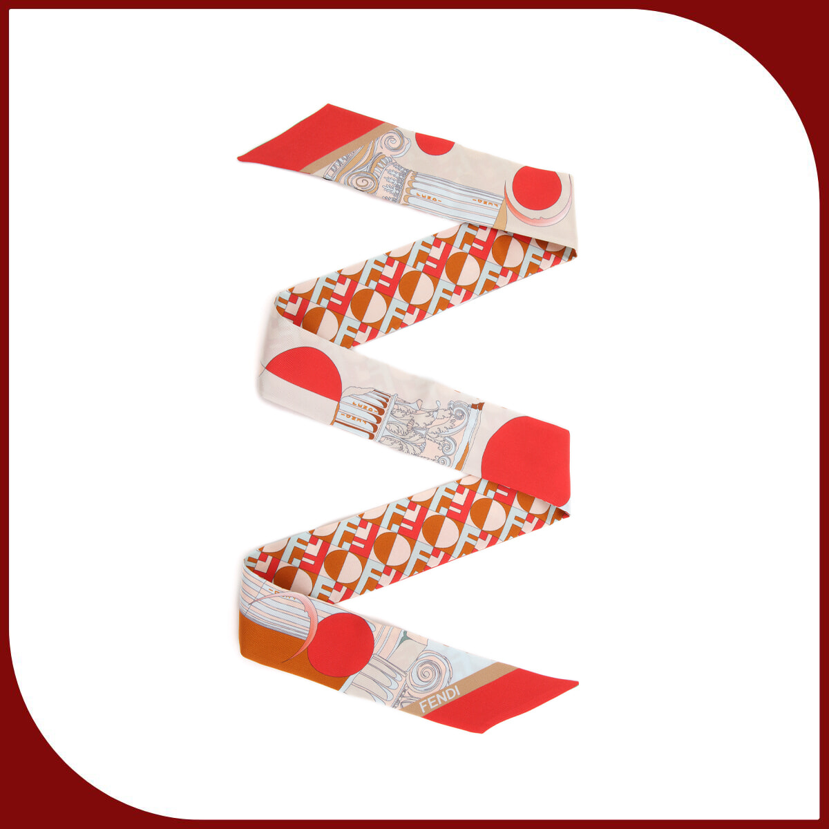 片面にローマのモザイクやアールデコのモチーフを再解釈したグラフィックを、もう片面に「フェンディ オプティカル」のグラフィックをあしらった、両面どちらも楽しめる「ラッピー」スカーフ。