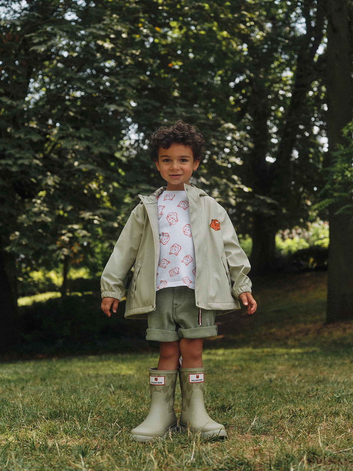メゾン キツネ × ハンター キッズ レインジャケット¥22,000、同フォックスヘッズ キッズ Tシャツ¥9,350、同フォックスヘッズ キッズ ファーストブーツ¥14,300/以上メゾン キツネ