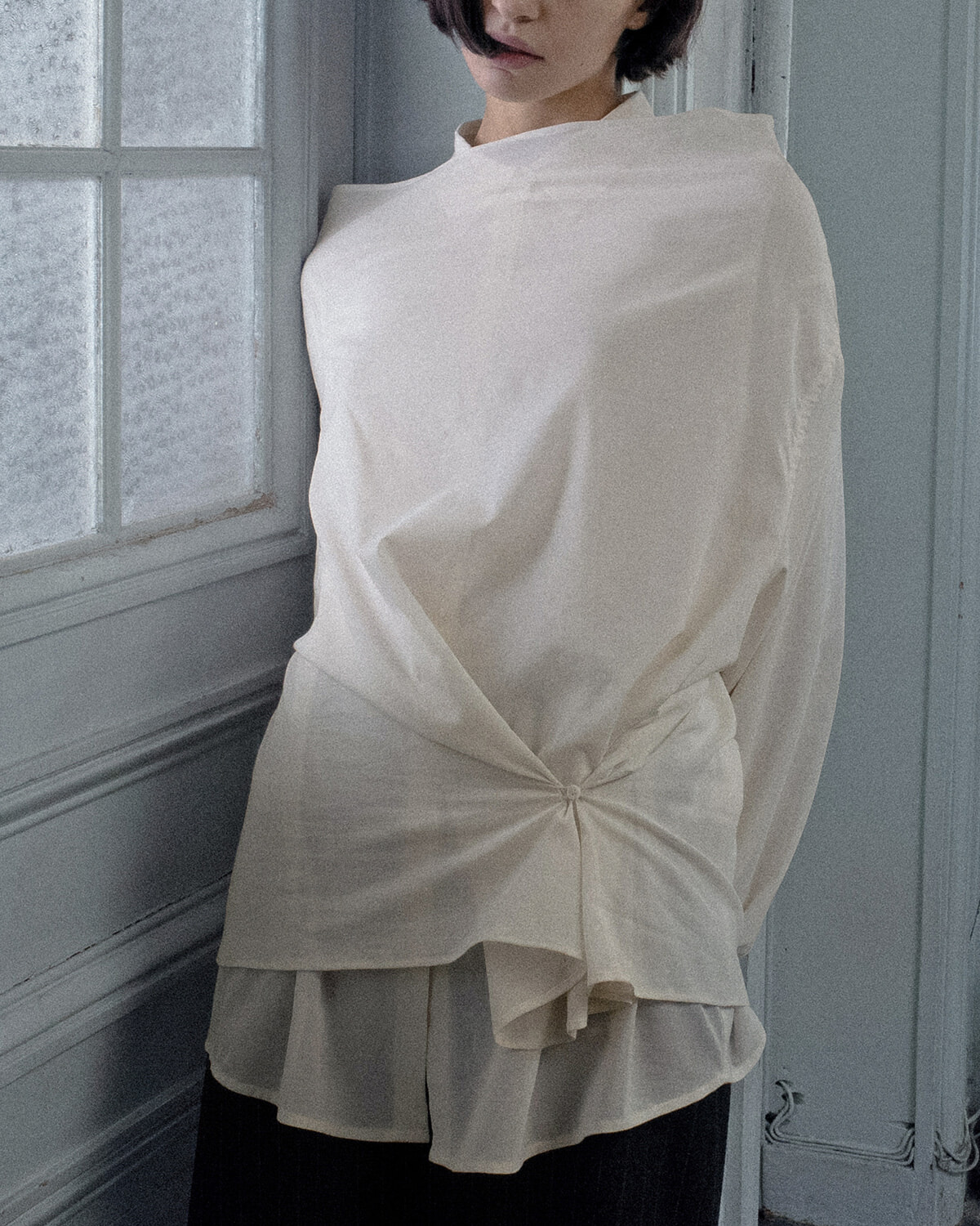 シアーコットンクラシックシャツ¥25,300、上に重ねたモックネック2WAYブラウス¥27,500