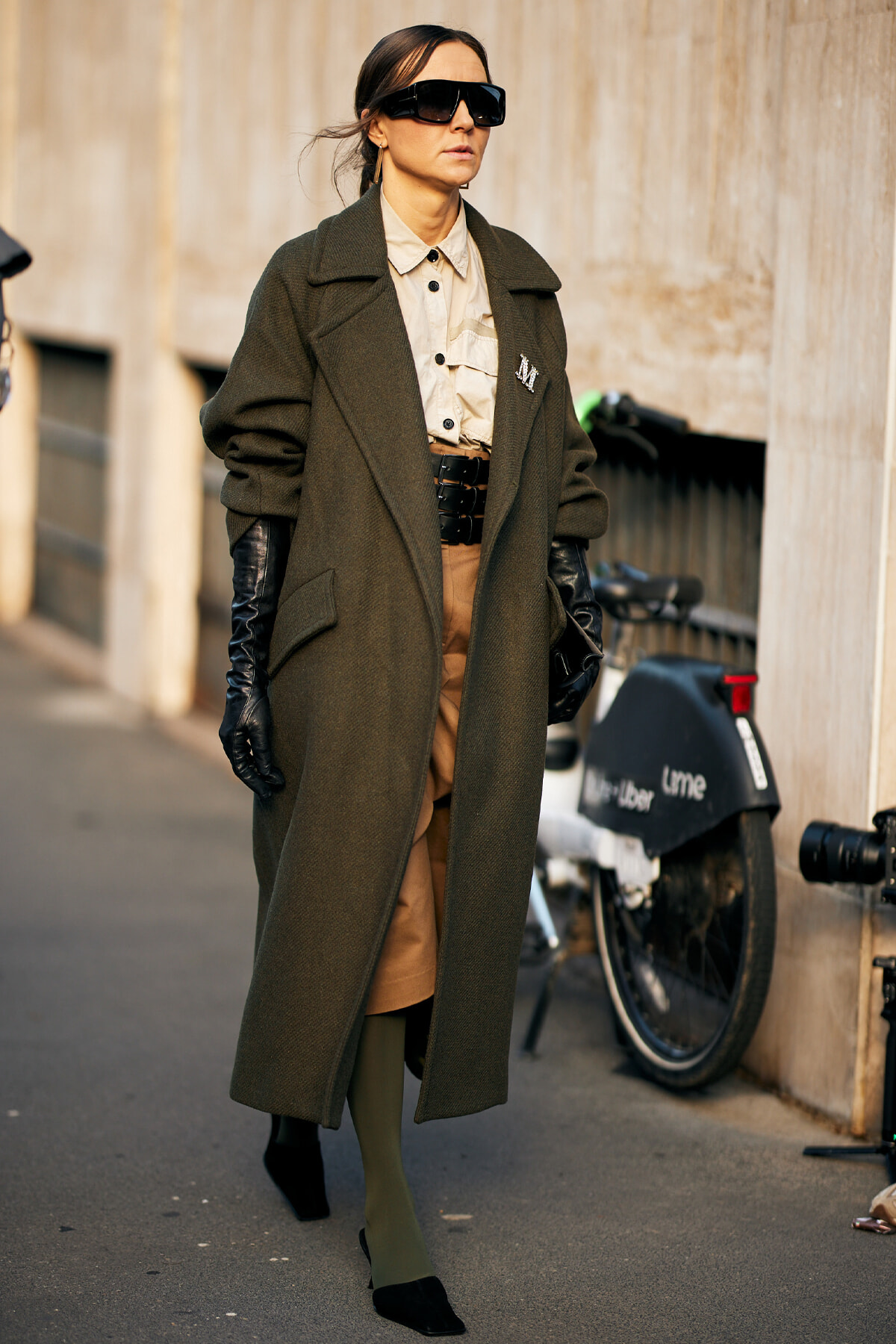 最初はミリタリー風のムードが漂う、ミラノで出会った方。オーバーサイズのコートに加え、同じベルトの3本重ねをはじめ、太いテンプルのサングラス、レザーのグローブといった小物使いで、タフな印象を生み出している。