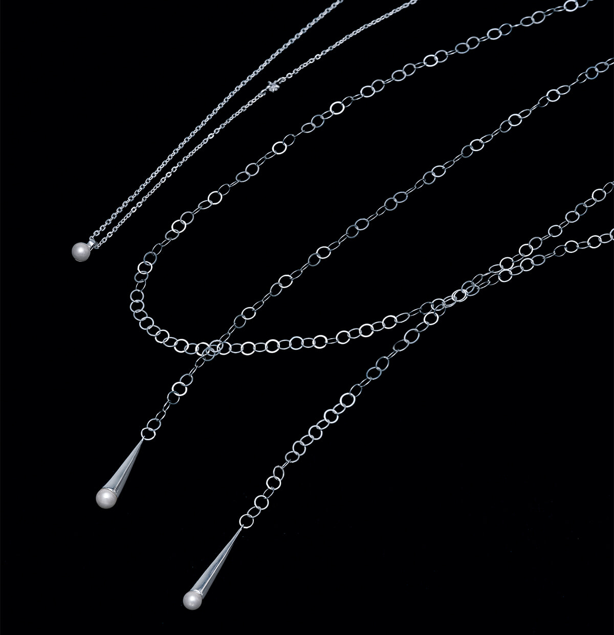 煌めきが印象的なネックレスは、チェーンを軌道に見立てたデザイン。月をイメージした取り外し可能なパールモチーフとダイヤモンドのひとつ星が光る。サークルが連なるロングネックレスはラリエット仕様。巻いたり、結んだり、一連で垂らしたりと自在なアレンジでコーディネートを。