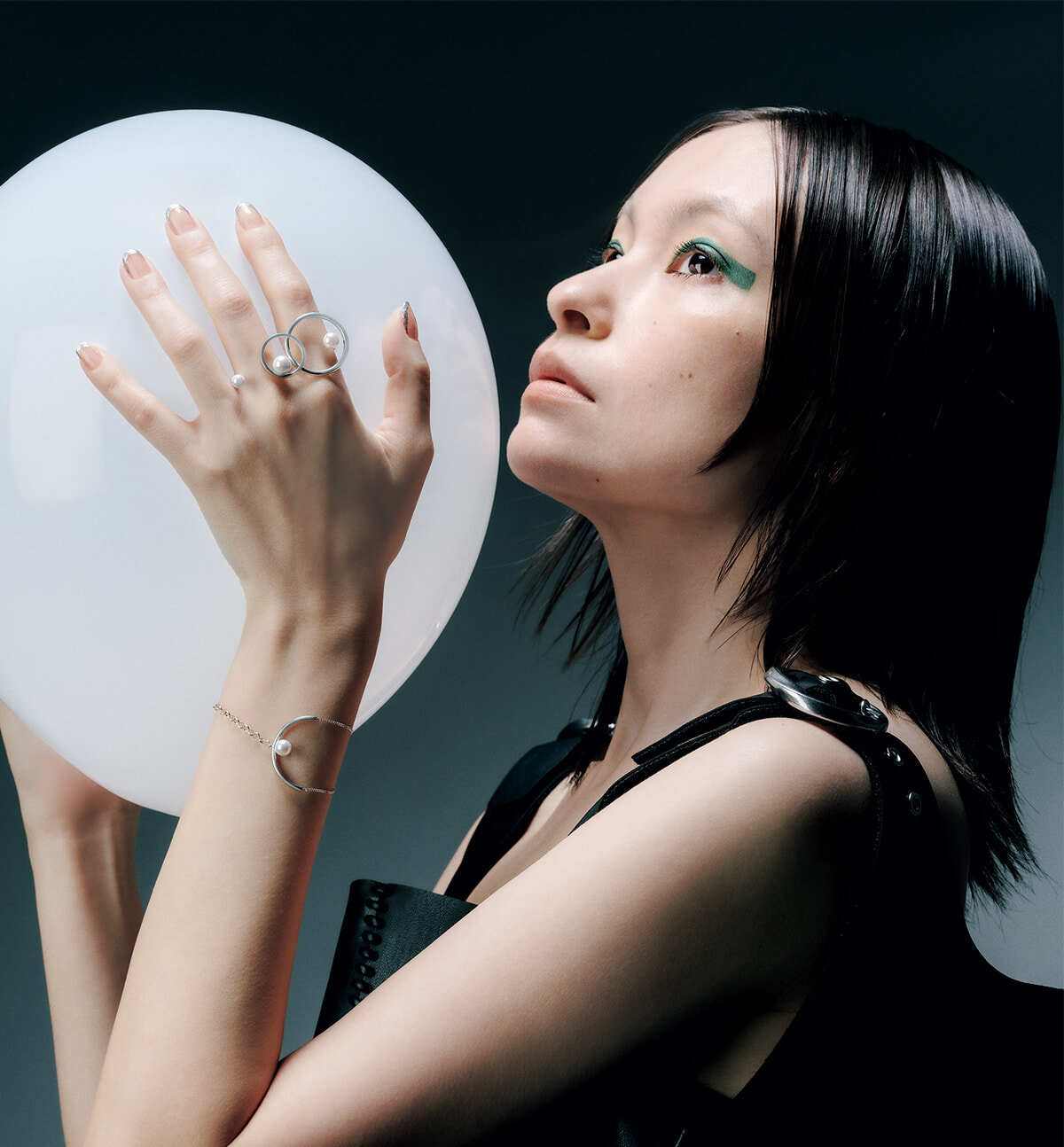 大小のパールがあしらわれたフォークリングに、ふたつのサークルがアイキャッチなデザインを重ねると、サイズの異なる3つのパールが連なり幻想的な佇まいに。ブレスレットは三日月型のバーにパールを一粒トッピング。2種類のチェーンと先端にもあしらわれたパールがどんな角度からも美しいシルエットを描く。
