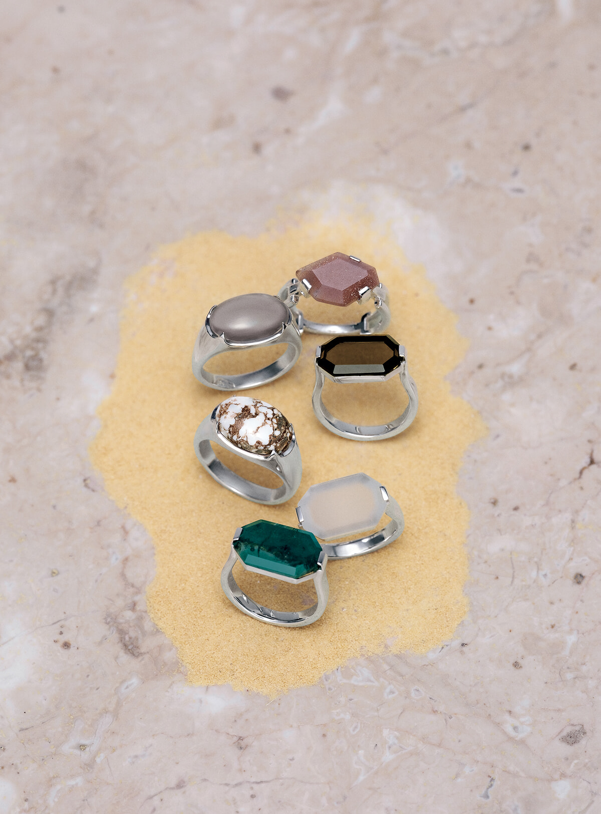 オーバル、八角形、変形六角形とスモーキーな天然石をプレイフルに楽しめるリングコレクション。留め方にもこだわり、石とのコンビネーションで手元にフレッシュな佇まいを宿す。