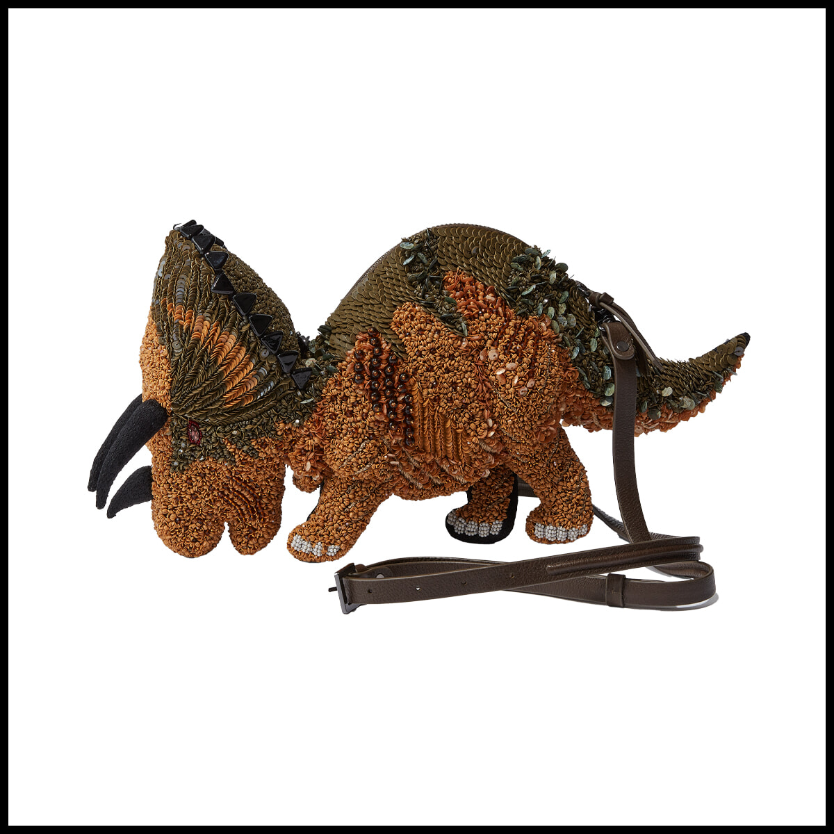 インドの熟練職人たちの手仕事が光る、恐竜のビーズバッグが登場。裏面は恐竜の骨柄。