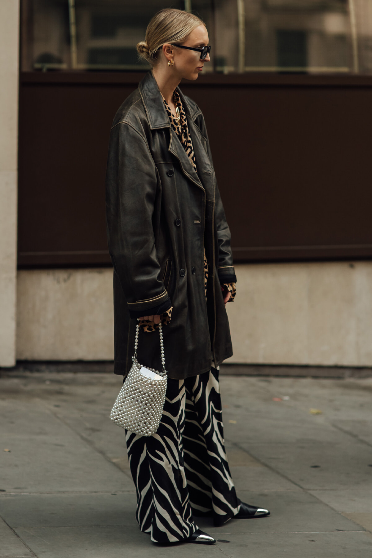 ロンドンでキャッチした次の方もアニマル柄を選択。さらに、レオパード×ゼブラと、異なる動物を掛け合わせている。レザーコートの黒が仲介役に。