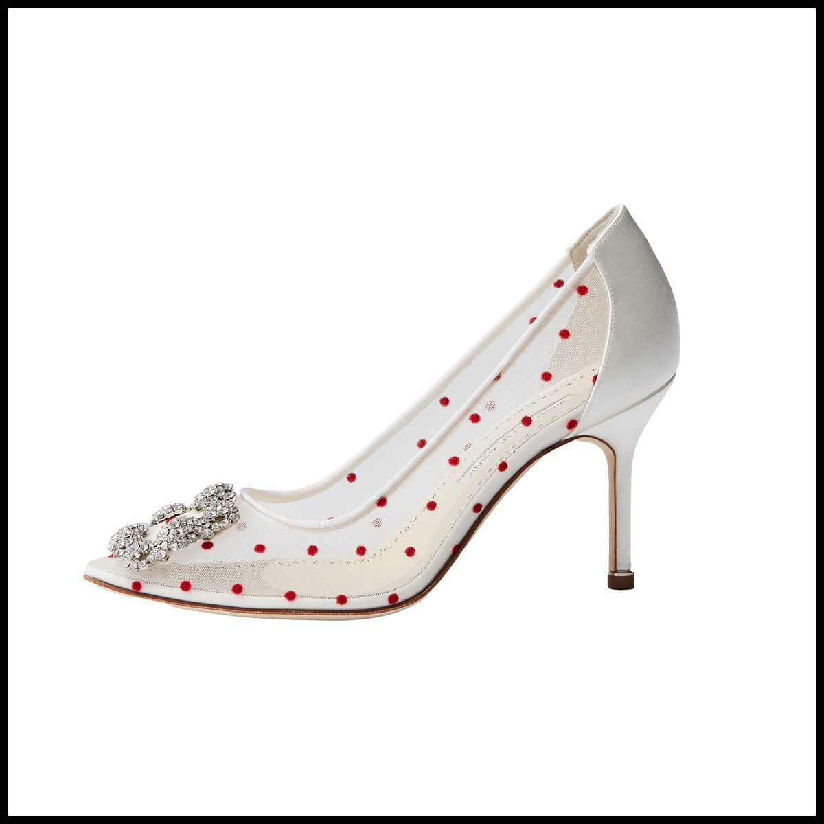 メッシュ素材にポルカドットのフロッキー加工を施したプレイフルな一足。