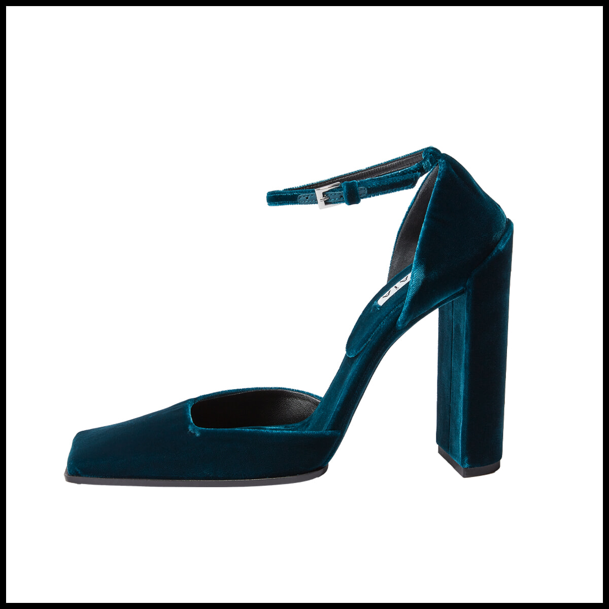 重厚感が漂うブルーベルベットのアンクルストラップパンプス「ドルセー」。