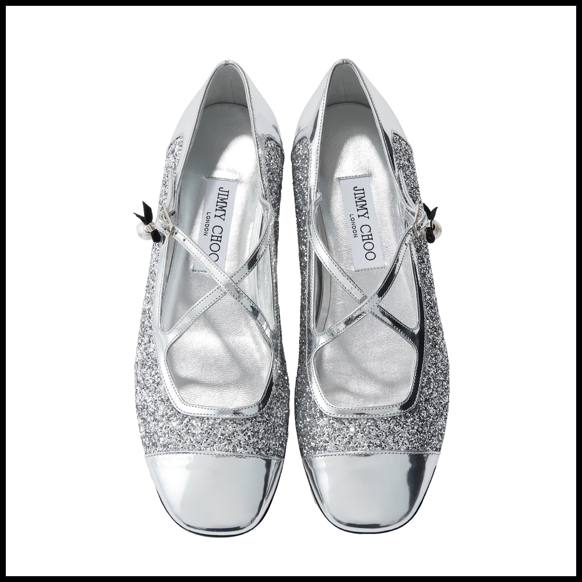 輝くグリッターとクロスしたストラップがフェミニンな、バレリーナシューズの新作。ベルト部分にはJCモノグラム付きパールも。