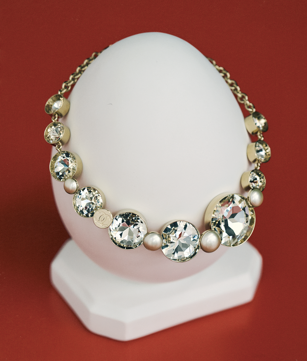 大きさの異なるラインストーンとコスチュームパールが大胆にあしらわれた存在感たっぷりのネックレス。いつもの着こなしをぐんと格上げする頼もしいスペシャルピース。