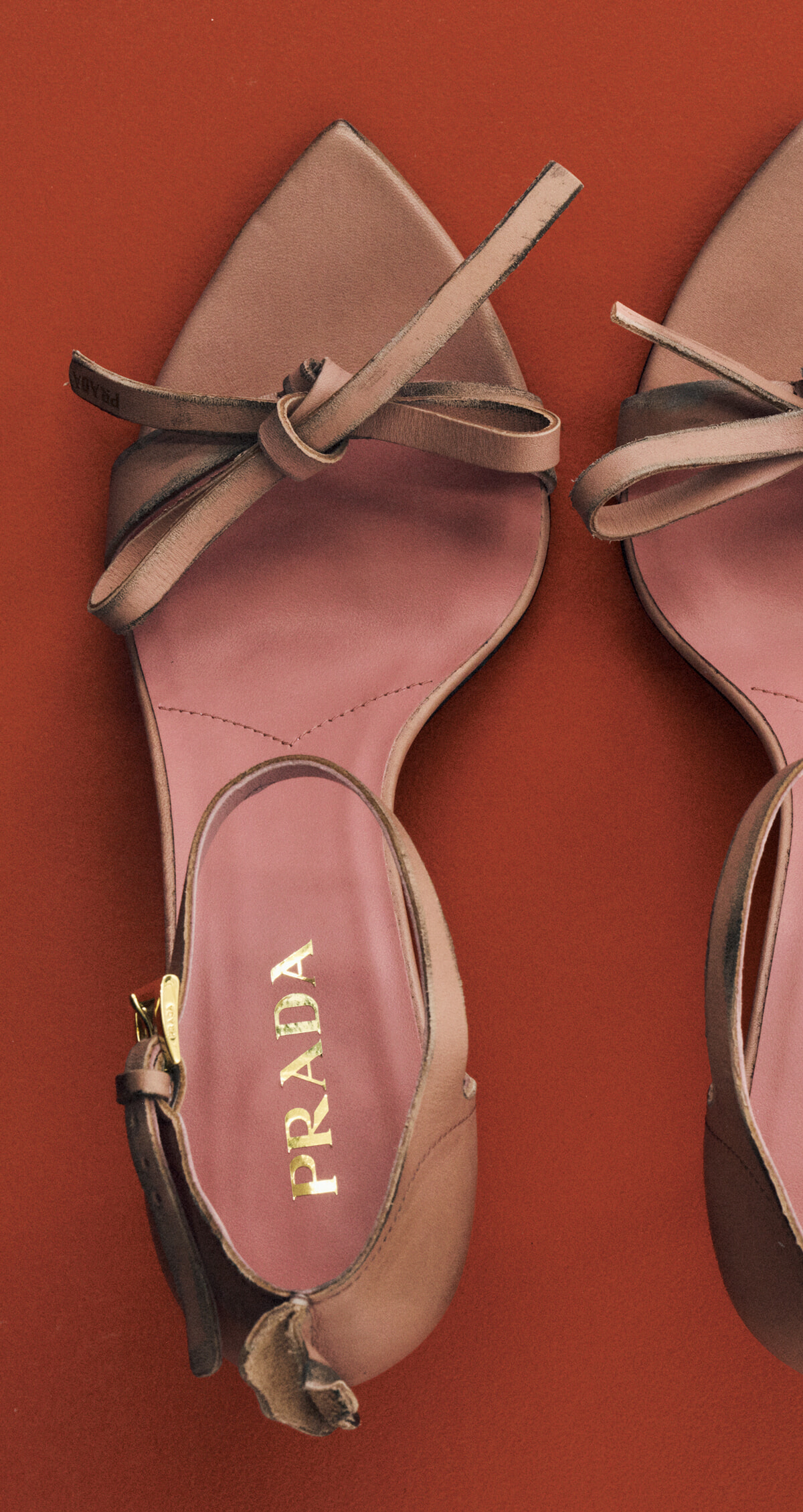 ロマンティックなリボンのサンダルに施されたのは、経年変化を帯びたようなエイジング加工。荒々しさとエレガンスが共存する魅惑の一足。