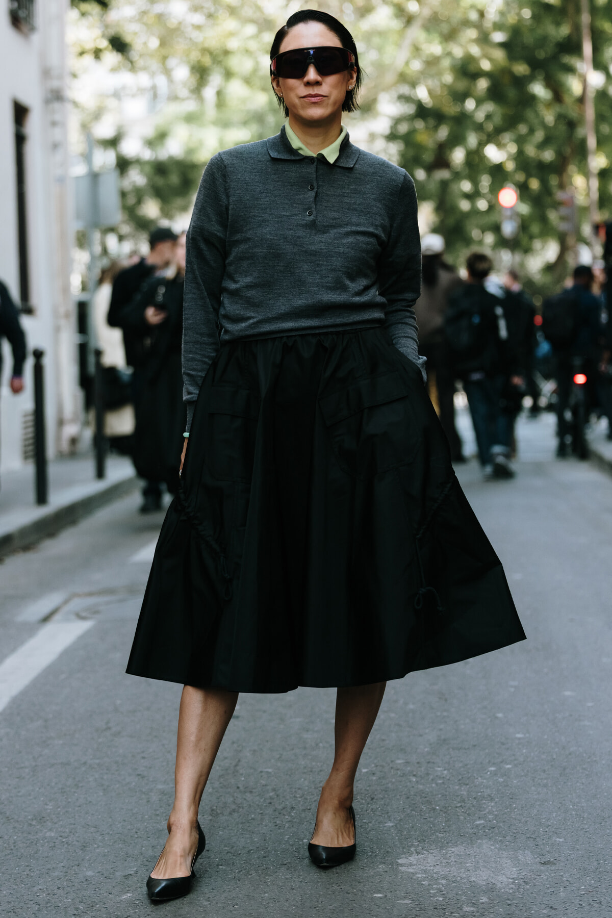 まずはパリでキャッチしたインスタグラムのファッションパートナーシップディレクターのエヴァ・チェン。ポロニットのレイヤード+フレアスカート+ローヒールのパンプスというグッドガールな組み合わせはまさに今の気分。ハードな印象のサングラスでパンチを効かせている。