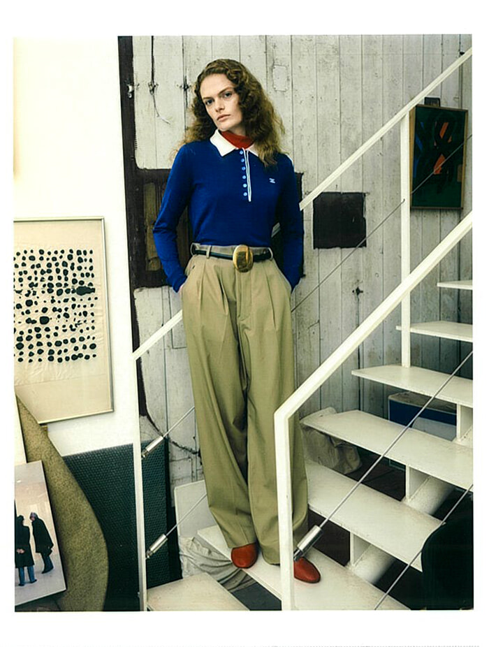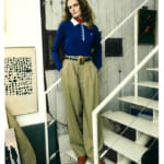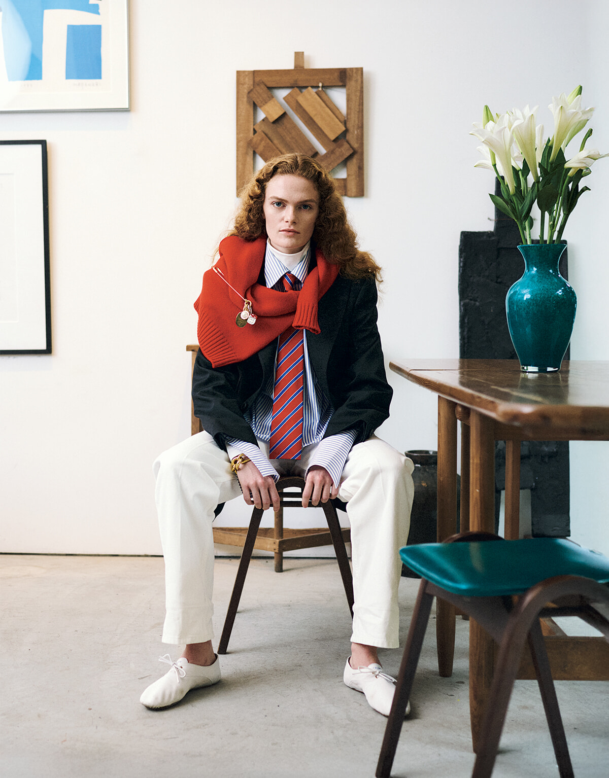 「クラシックなパターンのスカーフ、ブルーのニット、チノパン、どれも私自身が好きなもの。一見ベーシックではありますが、シャツのカフスの長さ、チノパンに入った立体的なダーツ、スラックスのシルエット、繊細なステッチワーク、すべてが細かくデザインされていると感じます」。