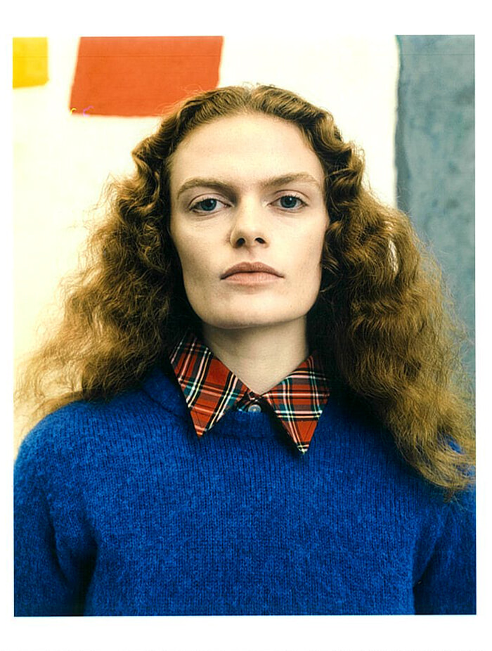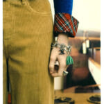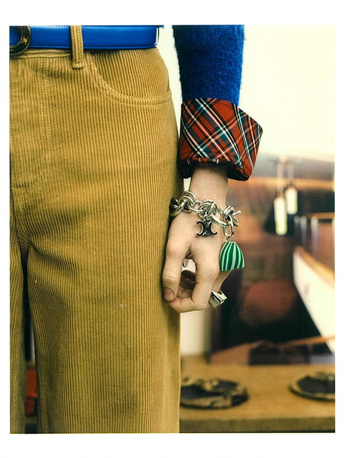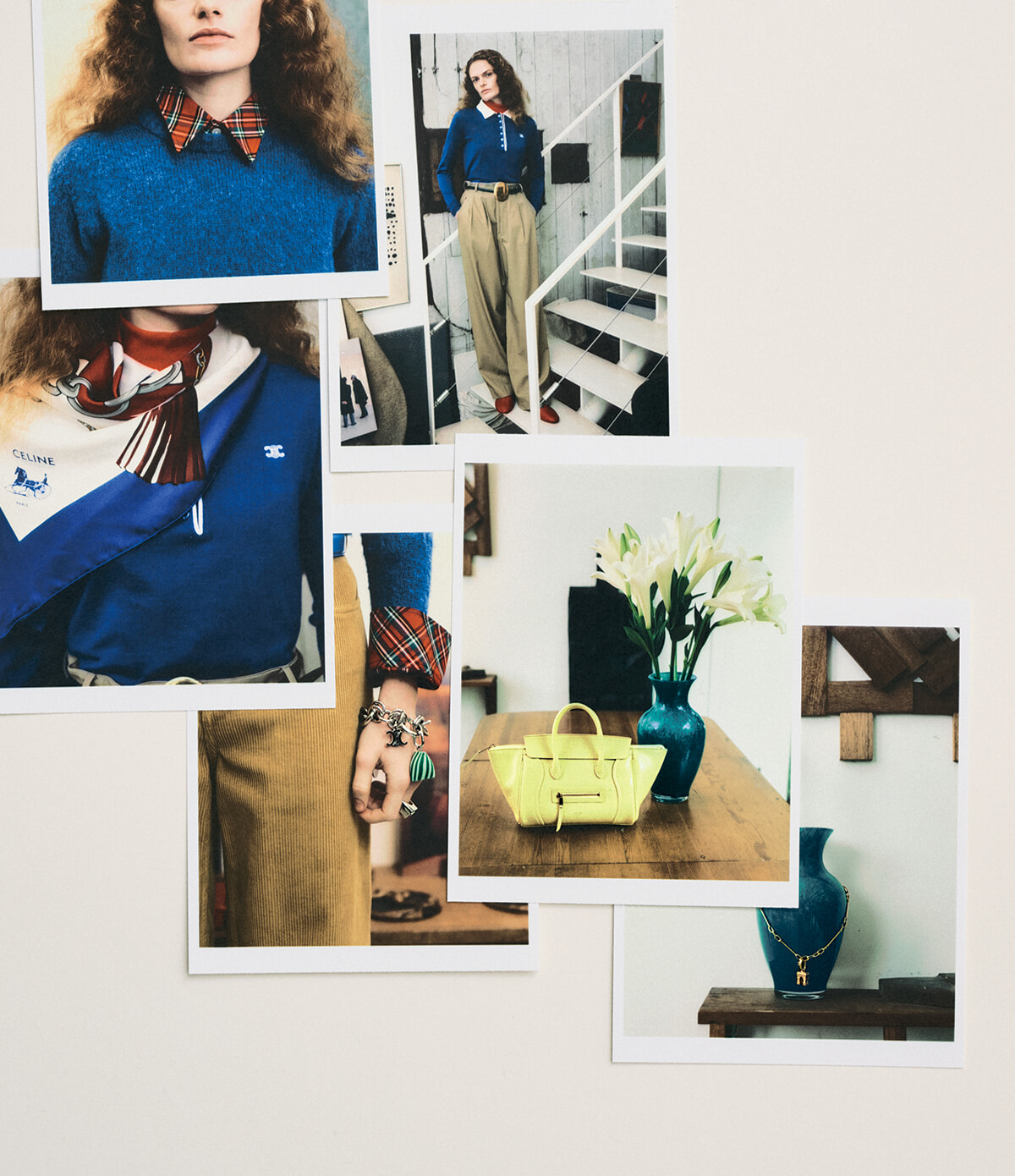 「新アーティスティック・ディレクターであるマイケル・ライダーが手がけた初のコレクションを目にした時、デイヴィッド・ホックニーのポートレートが脳裏を過りました。鮮やかな色彩。身体にすっとなじむジャストなサイズ。過度に崩さず、端正にまとめたトラッド。セリーヌの奥底には、パリのブルジョアジーが息付いています。だからこそ、王道のプレッピーからほんの半歩だけ外して、着る人の趣味や個性がにじむ”クセ”をスタイリングで添えました。私自身、冬になると常にニットを肩に掛けて過ごしています。そんな自分自身のスタイルを重ね合わせて、スタイリングを組みました」。