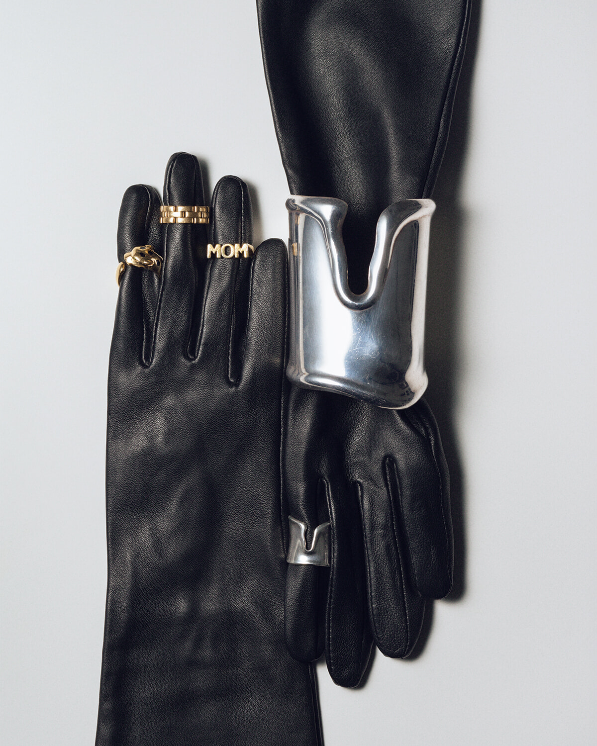 時計を着けないため、大きな存在感を放つティファニーのボーン カフが手元のジュエリースタイリングの軸に。プレイフルに仕上げるために欠かせないのは、20代の頃から愛用している、マリア ブラックのMOMというレタリングリング。コスチュームジュエリーらしいファニーさと、カルティエのふたつのリングと相性が良いコーティングゴールドで手元を彩る。