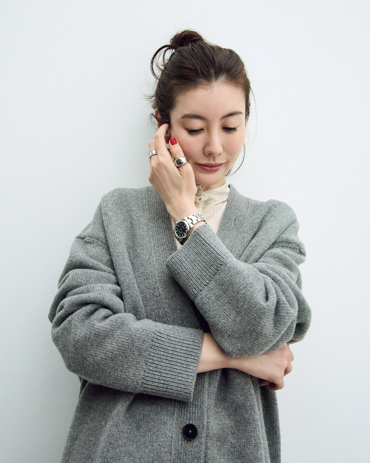 「長年ホワイトゴールド派の私。数年前、装飾性に惹かれてヴァン クリーフ&アーペルのペルレのリングを購入した際も、ホワイトゴールドを選びました。ちょうどその頃、シンプルなデザインでどんな服にも合わせやすいロレックスのオイスター パーペチュアルも手に入れたので、若い頃からサムリングとして愛用しているカルティエのヌーベルバーグと合わせて、白系で統一したい時によく身に着けています」。