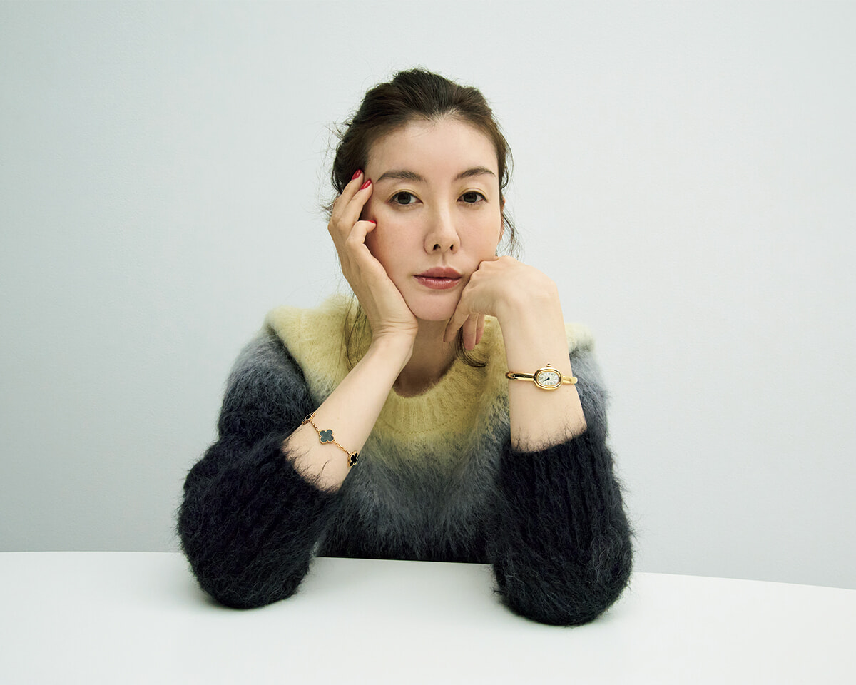 「カルティエのベニュワールは、発売当初からその可愛らしさに心を奪われ、いつか迎えたいとご縁を待ち続けていた時計です。一方、ヴァン クリーフ&アーペルのアルハンブラのブレスレットは、ベニュワールに合うようにと、夫がプレゼントしてくれたもの。それぞれ片腕に着けたり、その日の気分で時計だけ、またはブレスレットだけを楽しんだりと、気ままにコーディネートを楽しんでいます」。