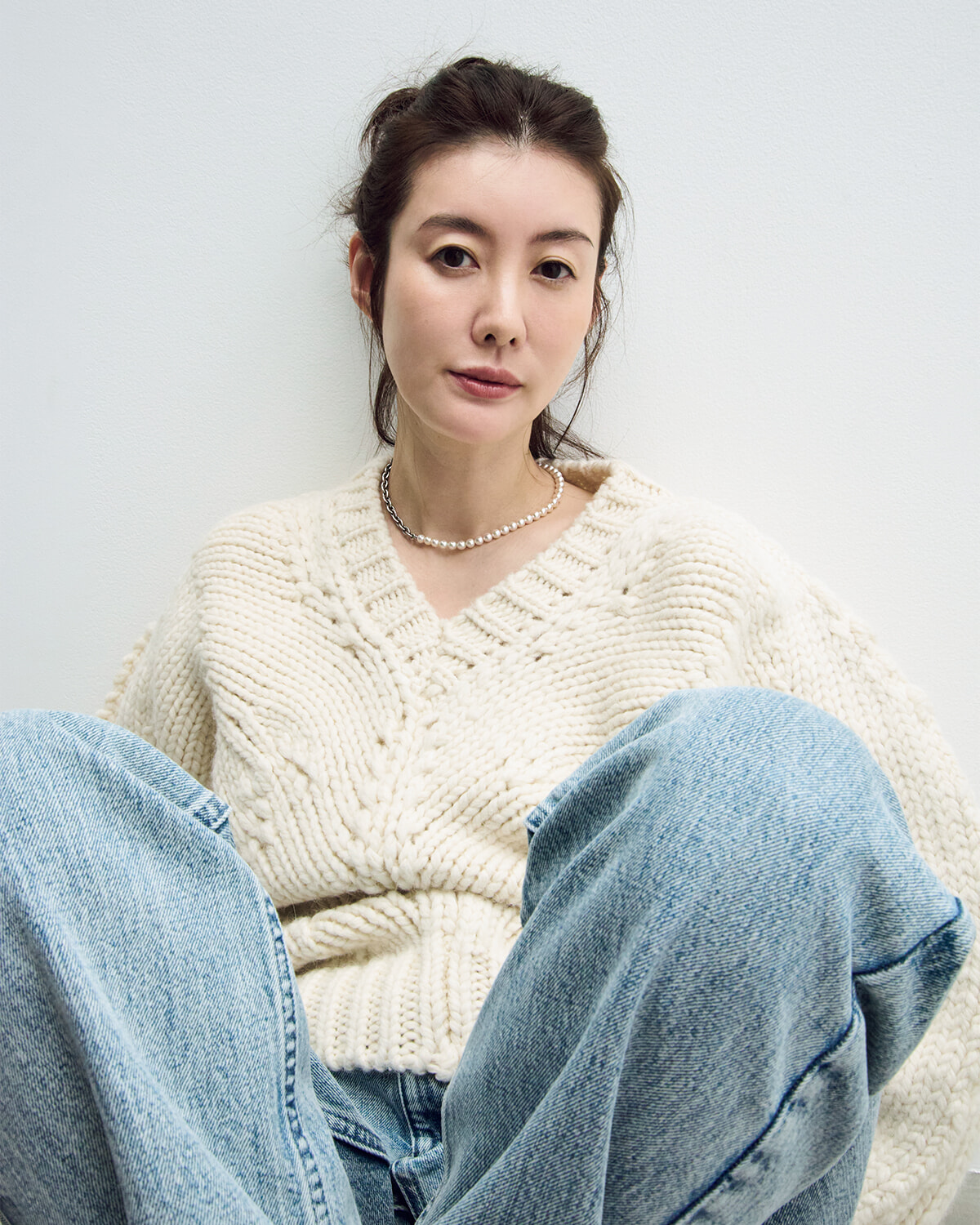 ネックレス/本人私物 ニット¥272,800、デニム¥173,800/ともにジル サンダー(ジルサンダージャパン)