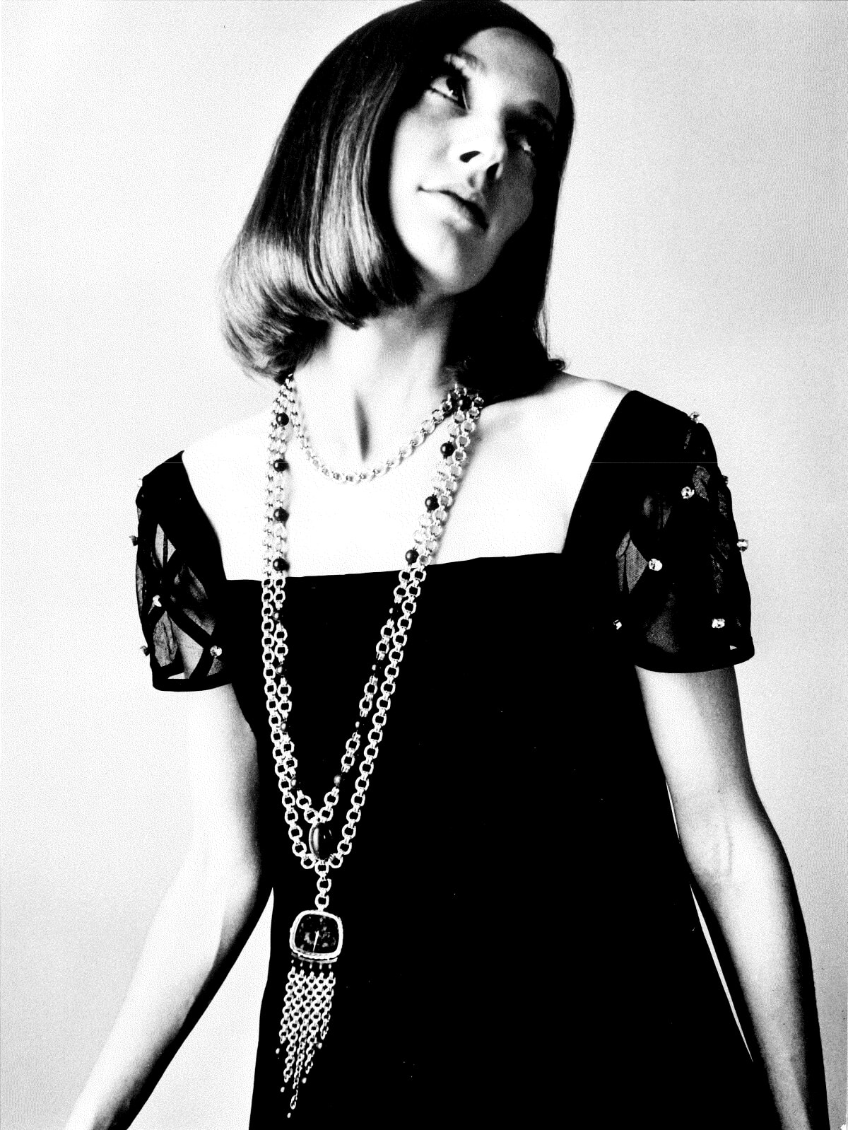 「ピアジェ ウォッチとは何より先にまずジュエリーである」というイヴ・ピアジェの思想のもと、ピアジェは時間を身に着けるという新たな美の在り方を提示した。首元を飾るソートワール(ロングネックレス)や、彫刻的なカフブレスレットに埋め込まれたダイヤル、そしてオーバルやトラペーズといった自由なフォルム。そこには、既存のデザインの枠を超え、女性の手元を美しく輝かせるという確かな意志が宿っていた。