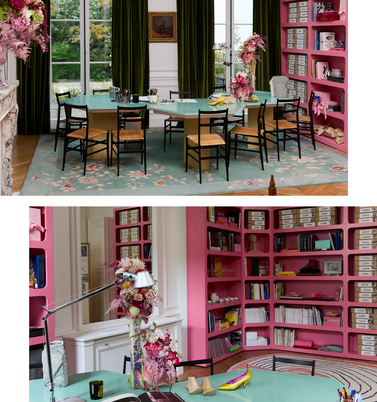 単なる仕事場以上の存在であるこのスタジオは、フェローニの無限のインスピレーション源によって形作られた”驚きの宝物箱”。スケッチやバックルの試作品、布切れといった、フェローニの手仕事の痕跡が、アイデアの宝庫となる書籍群やアーカイブシューズなどとともにスタジオを彩る。空間は彼の折衷的なパリの感性そのもの。鮮やかなピンクとグリーンの色調が、中国アールデコのラグ、アンティークのアームチェア、デュッチョ・マリア・ガンビによる彫刻的なデスクを囲む。緻密に構築された、彼の独創的な創造世界は、映画やパリらしさ、サヴォアフェールを、ラインや色彩、質感へと昇華させ、メゾンの現在のデザインを生み出しているのだ。