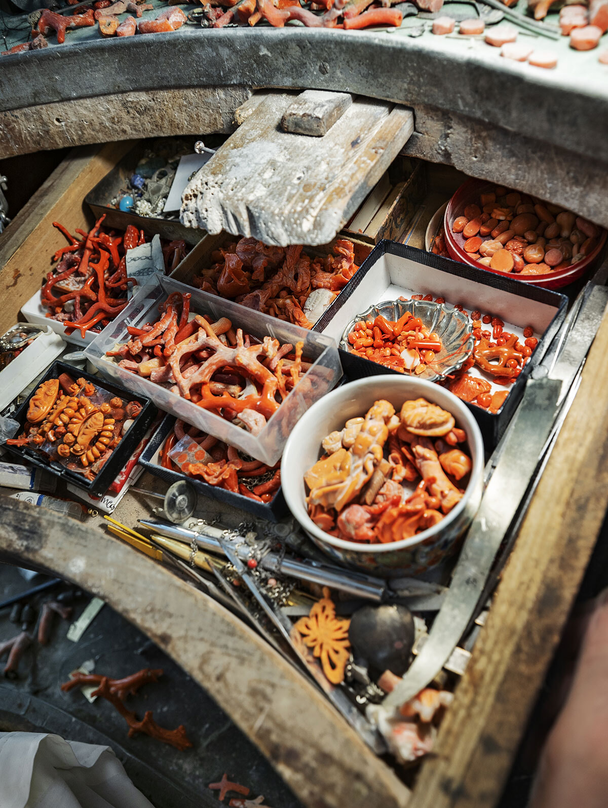 トラーパニ伝統の珊瑚工芸は赤い珊瑚のパーツを使用。