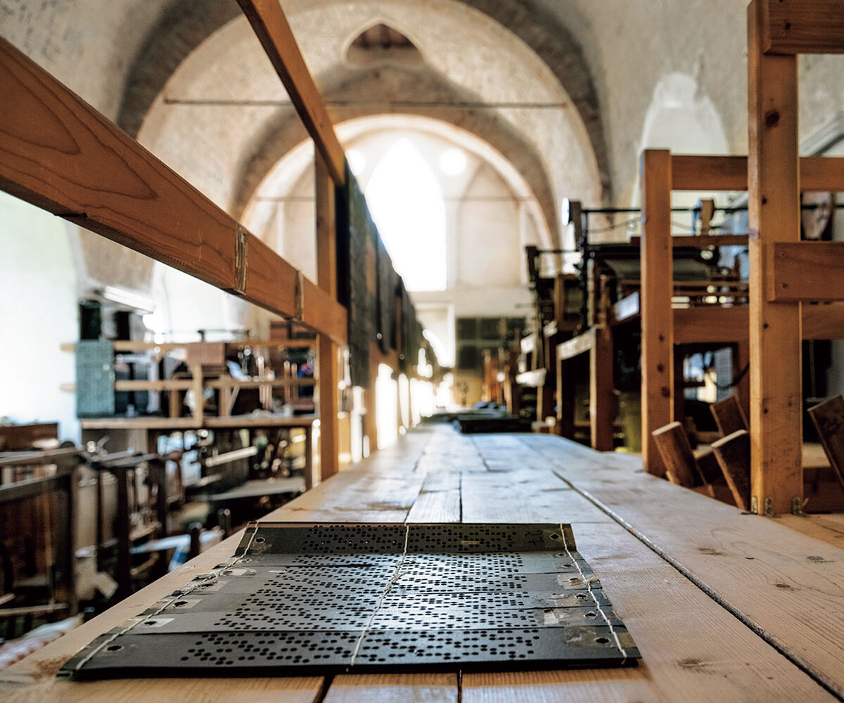 「ジウディッタ・ブロゼッティ」工房に並ぶ19世紀のアンティーク織り機。
