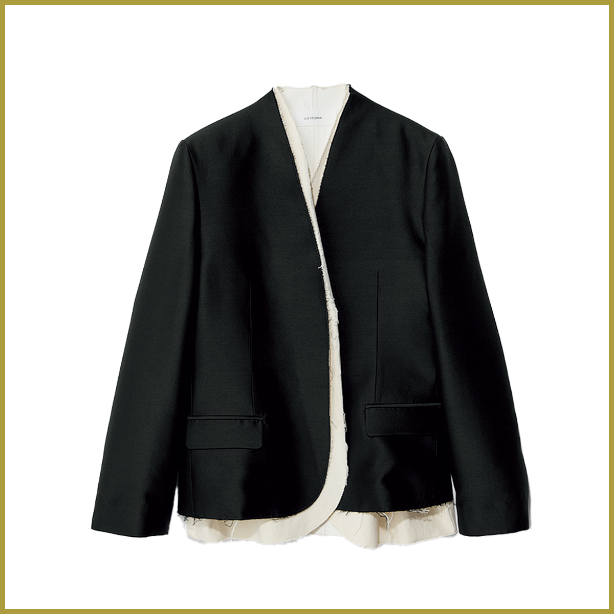 漆黒のジャケットに着脱可能の白いベストがレイヤード。切りっぱなしの仕立てが奥行きを与える。