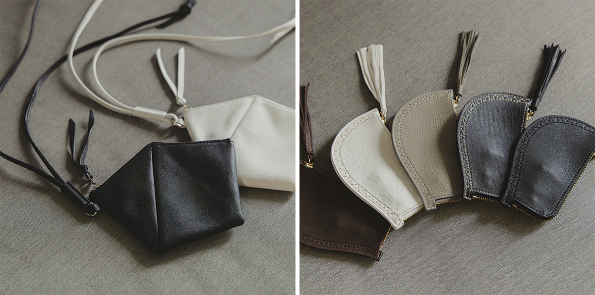 左:絵馬の形をしたミニ財布「GOKAKU」。 右:有機的なカーブが特徴のキーケース。
