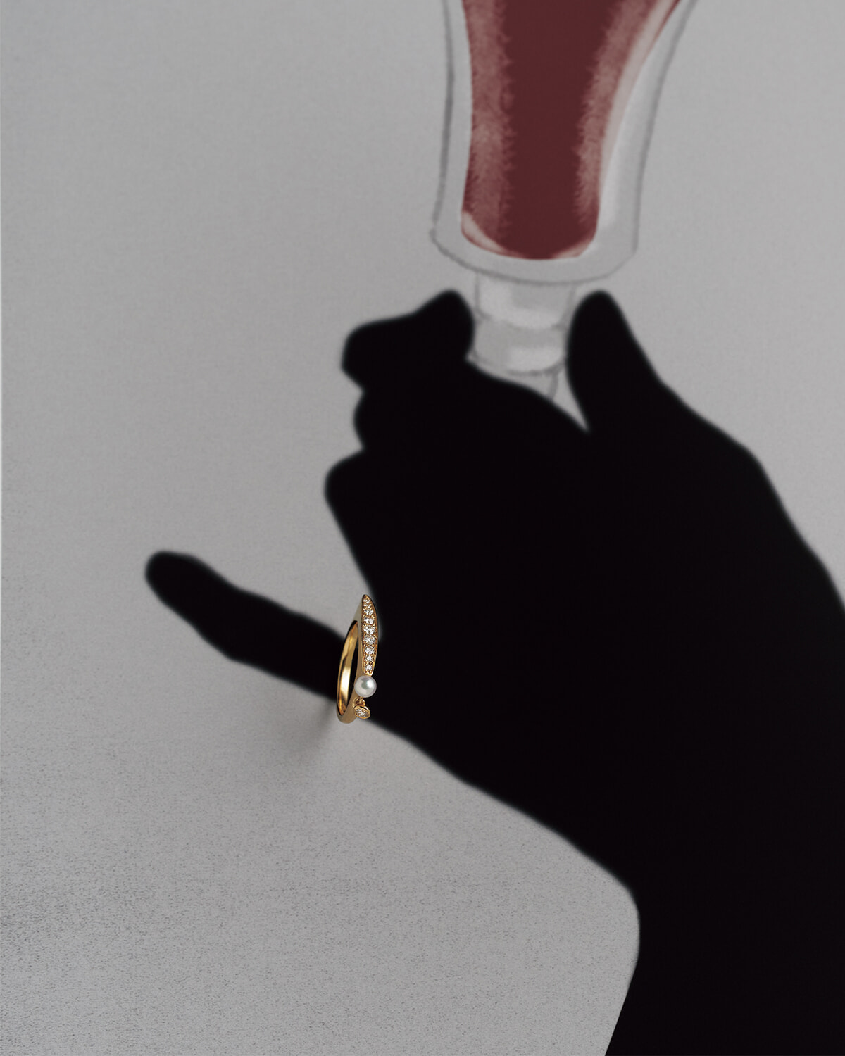 現代のミキモトの「ディナーリング コレクション」は、ディナーを楽しむ大人たちのための優雅なピンキーリング。グラスを持つ手、ナイフやフォークの動きにダイヤモンドが揺れて煌めき、”見る”と”見られる”の両方で存在感を発揮する。上質なダイヤモンドだけを厳選してあしらっているから、キャンドルの炎にもキラリと映えて、白い光を振りまく様子が本当に美しい。