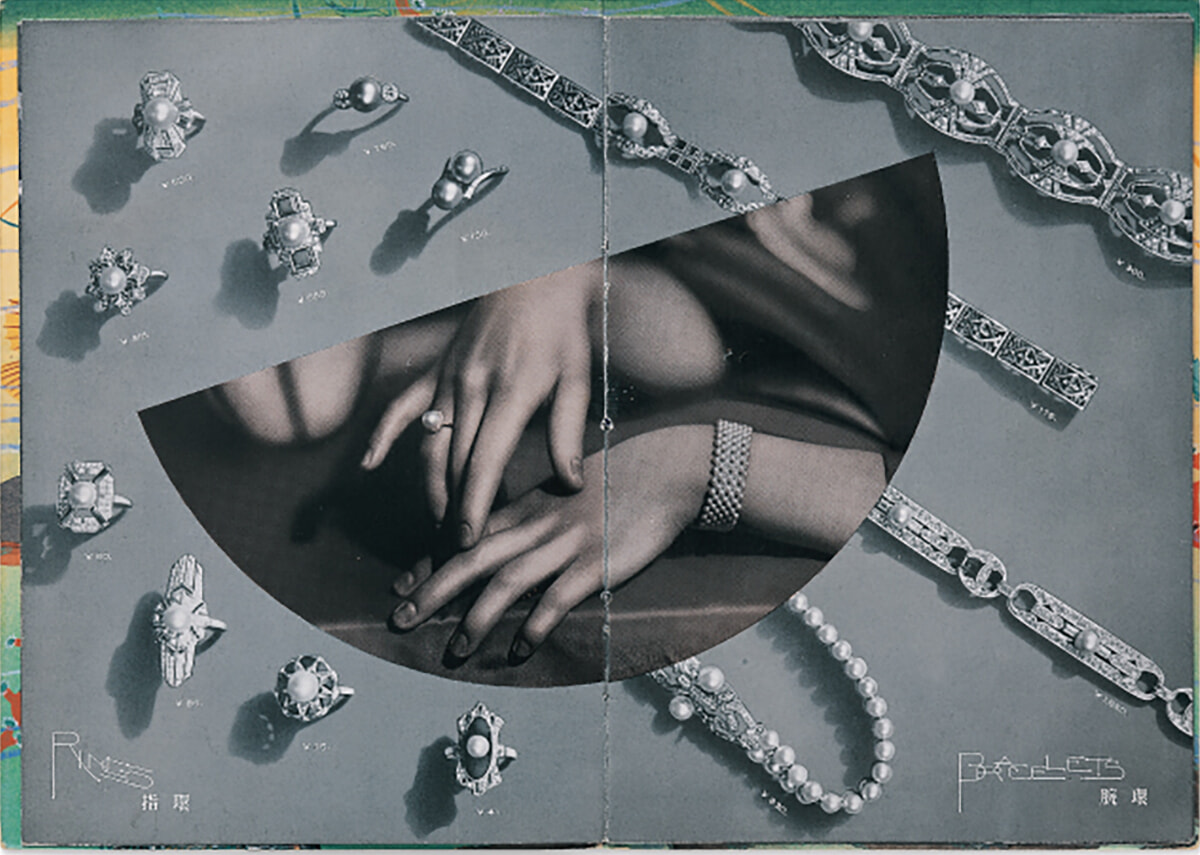 昭和11(1936)年の御木本真珠店(現ミキモト)のカタログ『真珠』。リングを着けた手元が上品に表現されている。