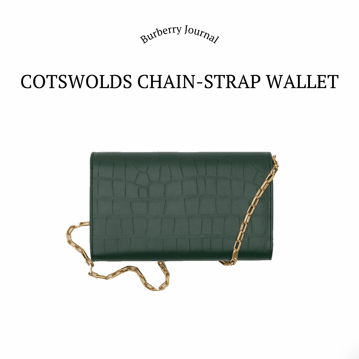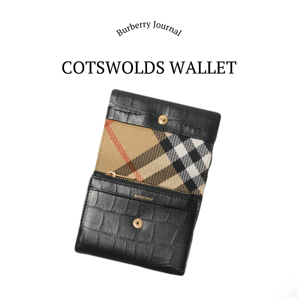 光沢を抑えたレザーに、クロコダイル風の加工を施したコッツウォルズ。カードも小銭もすっきり収まる設計で、スタイルを選ばず長く使える。ライニングにはアイコンであるチェックを採用し、開封するだけで気分も上々。