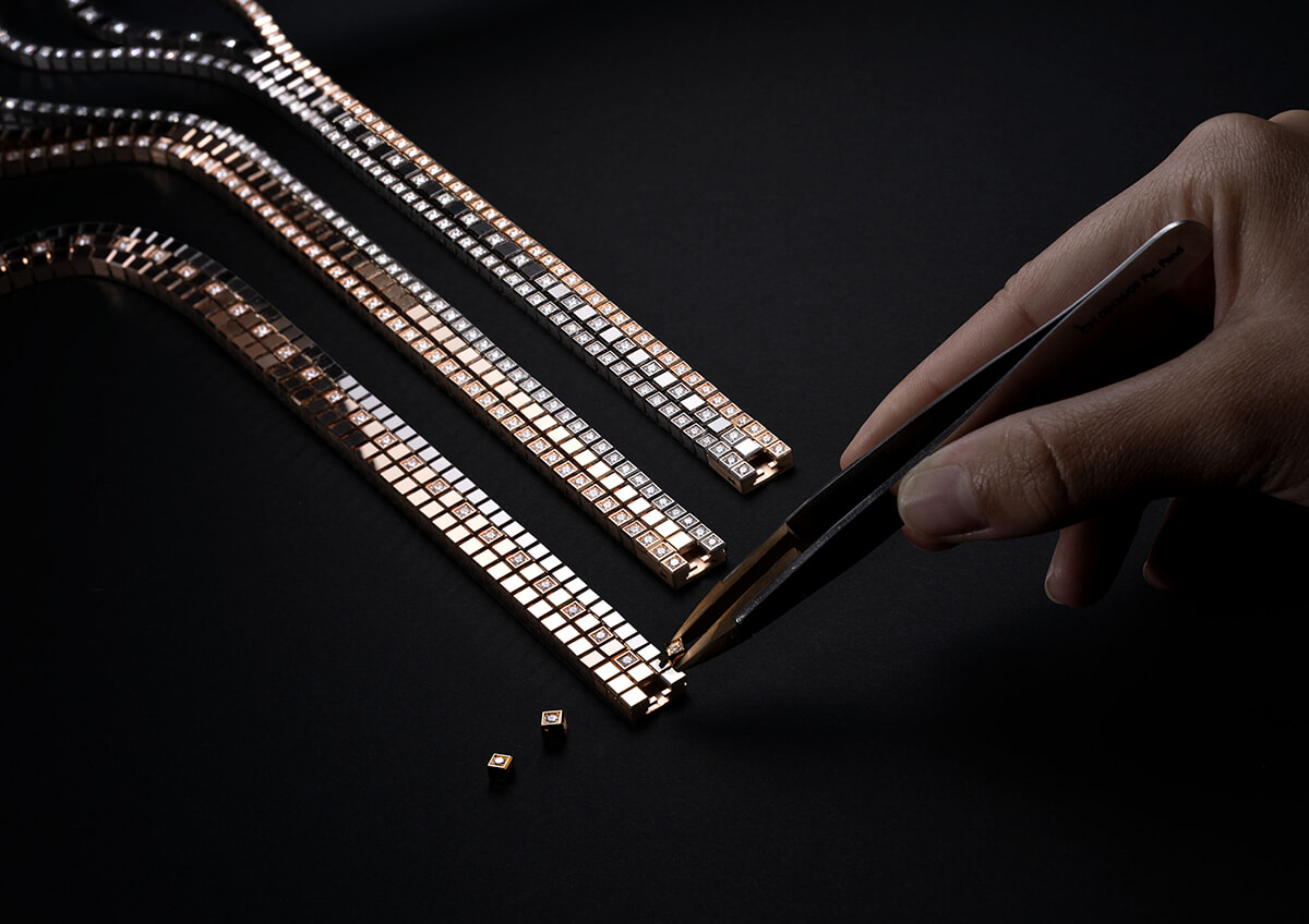 ネックレスには高さやサイズが異なる2種類のキューブがちりばめられ、ダイヤが埋め込まれたキューブも職人がひとつずつセッティングする。