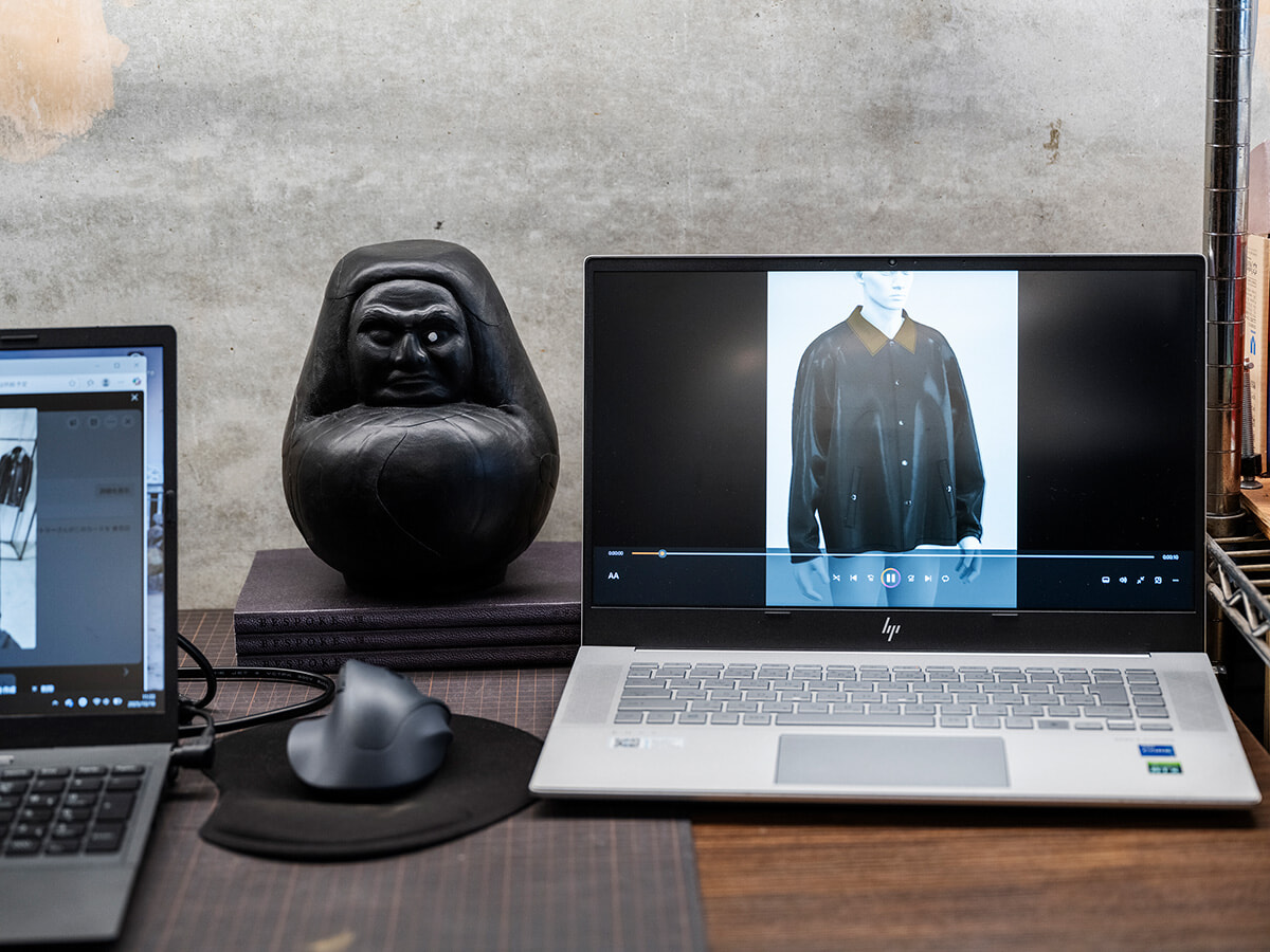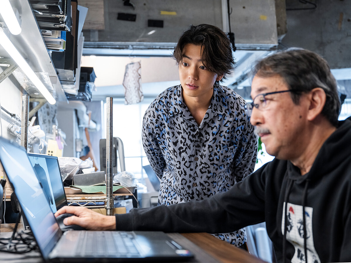 かつては紙の実寸で行っていたパターン制作も、現在はPCで行われる。ノーノーイエスのベテランパタンナー・上野ユージさんの画面を覗き込む。